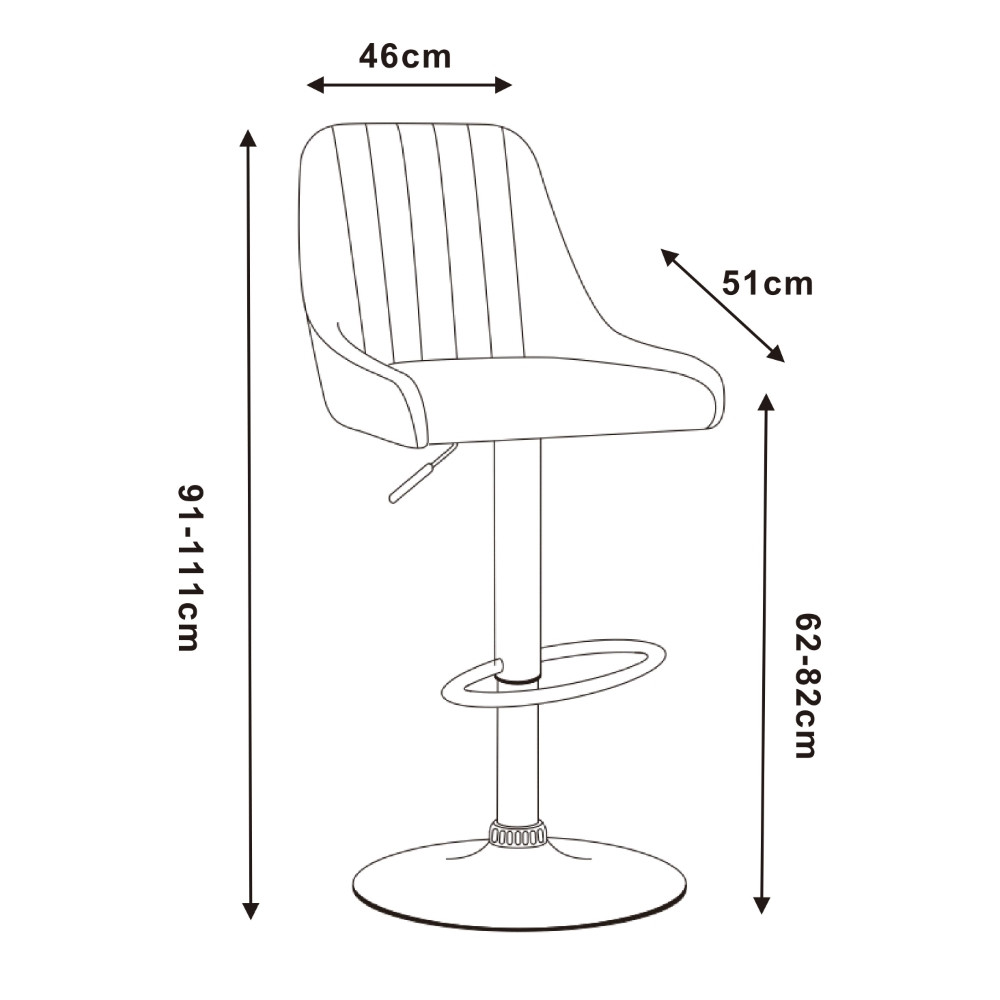 Oblazinjen barski stol, na voljo v sivi barvi. Stranice sedišča so za udobnejše sedenje privzdignjene, naslon za hrbet pa je prešit z okrasnimi šivi, ki popestrijo videz stola. Stol je vrtljiv in nastavljiv po višini, s plinskim mehanizmom v nosilnem stebru. Višina sedišča je nastavljiva od 62 do 82 cm. Podnožje je opremljeno z naslonom za noge v obliki polmeseca. Nosilni steber je izdelan iz kovinske cevi in za boljšo zaščito kovine prašno lakiran. Velika talna plošča zagotavlja dobro stabilnost stola. Maksimalna nosilnost barskega stola je 120 kg.