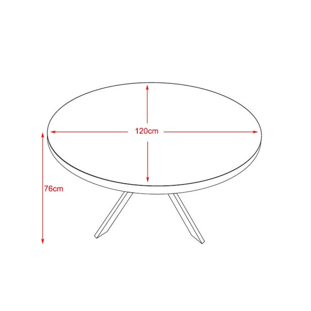 Okrogla jedilna miza, z belim namizjem premera 120 cm. Mizna plošča je izdelana iz sintranega kamna Snow bele barve, debeline 12 mm in stoji na črnem kovinskem okvirju debeline 50 mm. Sintrani kamen je narejen iz kombinacije naravnega kamna v različnih barvah in ima več prednosti pred navadno keramiko. Je močnejši od velikih keramičnih plošč in se ne razbije zlahka. V primerjavi s ploščami iz naravnega granita pa je tudi naravno vodoodporen. Prav tako je okolju prijaznejši od kemično obdelanih kremenčevih plošč. Noge mize, v "spider" stilu, so izdelane iz kovinskih cevi dimenzij 3x8 cm in za boljšo zaščito prašno lakirano v črno barvo. Maksimalna nosilnost mize je 120 kg.