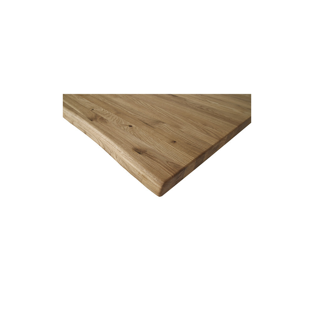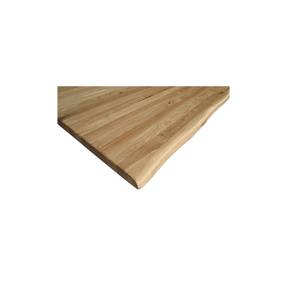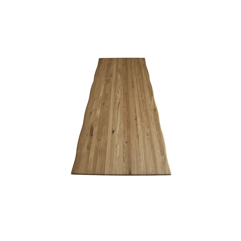 Mizna plošča z naravnim robom, narejena iz masivnega, oljenega, hrastovega lesa v rustik izvedbi. Plošča je debeline 2+2 cm. Na voljo so različne dimenzije. Plošča je kompatibilna z vsemi oblikami nog iz tega programa.