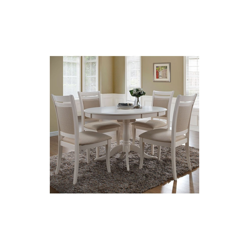Raztegljiva miza v enostavnem imerialnem dizajnu, ki ga poudarja noga v obliki pilastra in ovalna oblika. Miza je na voljo v kremno beli barvi. Plošča mize je narejena iz MDF materiala, podnožje pa je iz masivnega lesa kavčukovca. Miza se na sredini raztegne z dvojno ploščo, ki je shranjena pod glavno ploščo. Oglejte si še ostale izdelke iz iste linije.