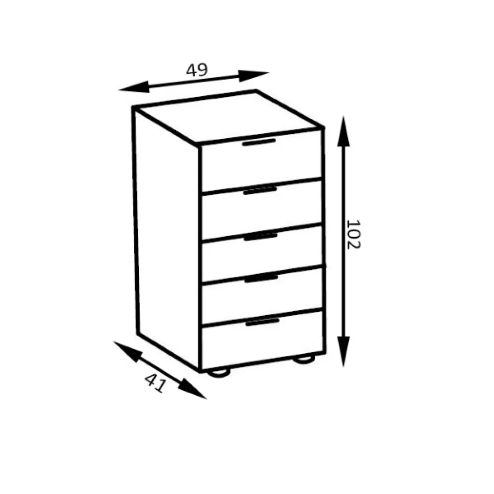 Velika komoda nemškega dizajna, v kombinaciji belega okvirja in steklenega pročelja v sivi barvi. Ima pet enako velikih predalov s kovinskimi vodili. Komoda stoji na štirih nizkih nožicah. Izdelana v Nemčiji. Oglejte si še ostale elemente tega programa.