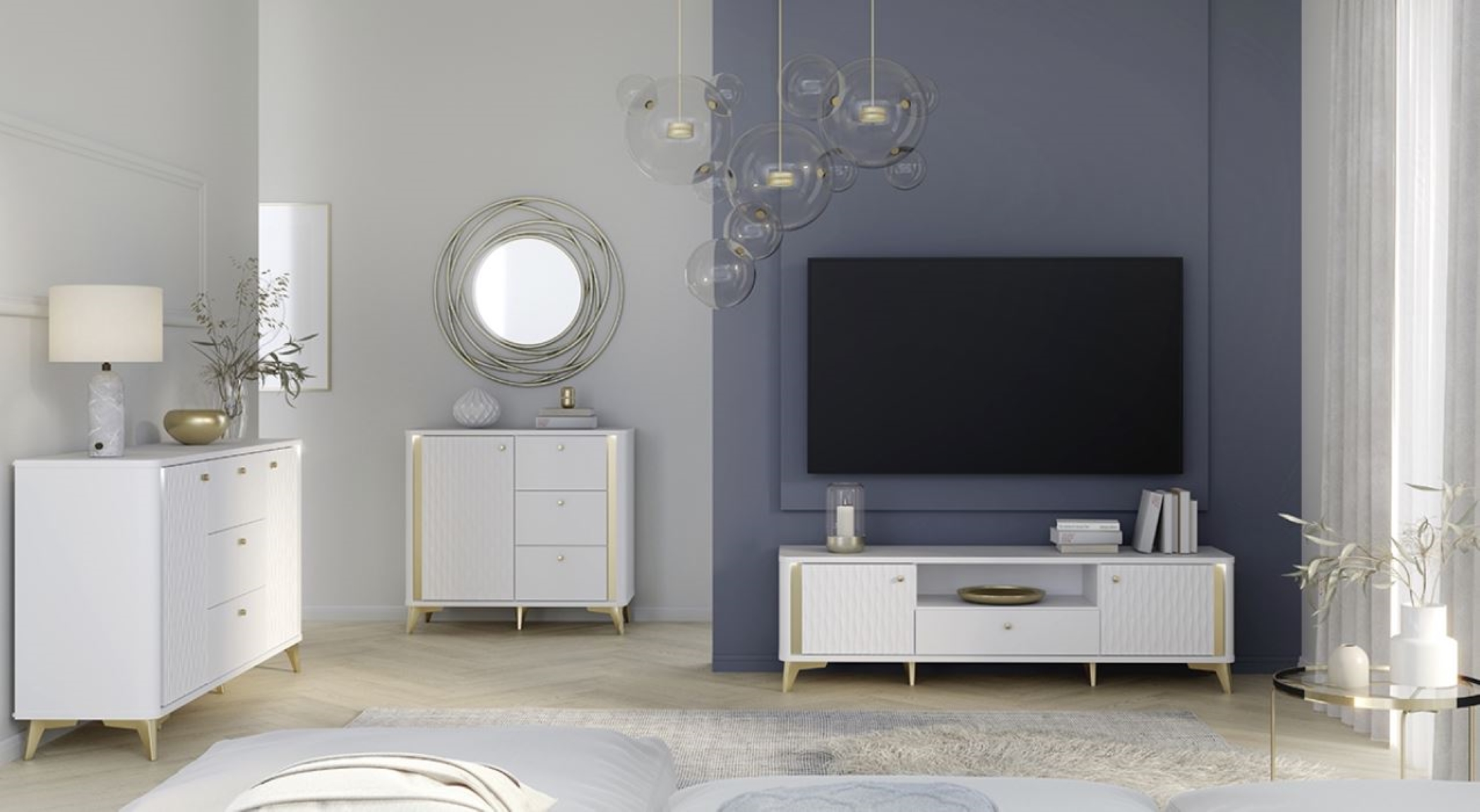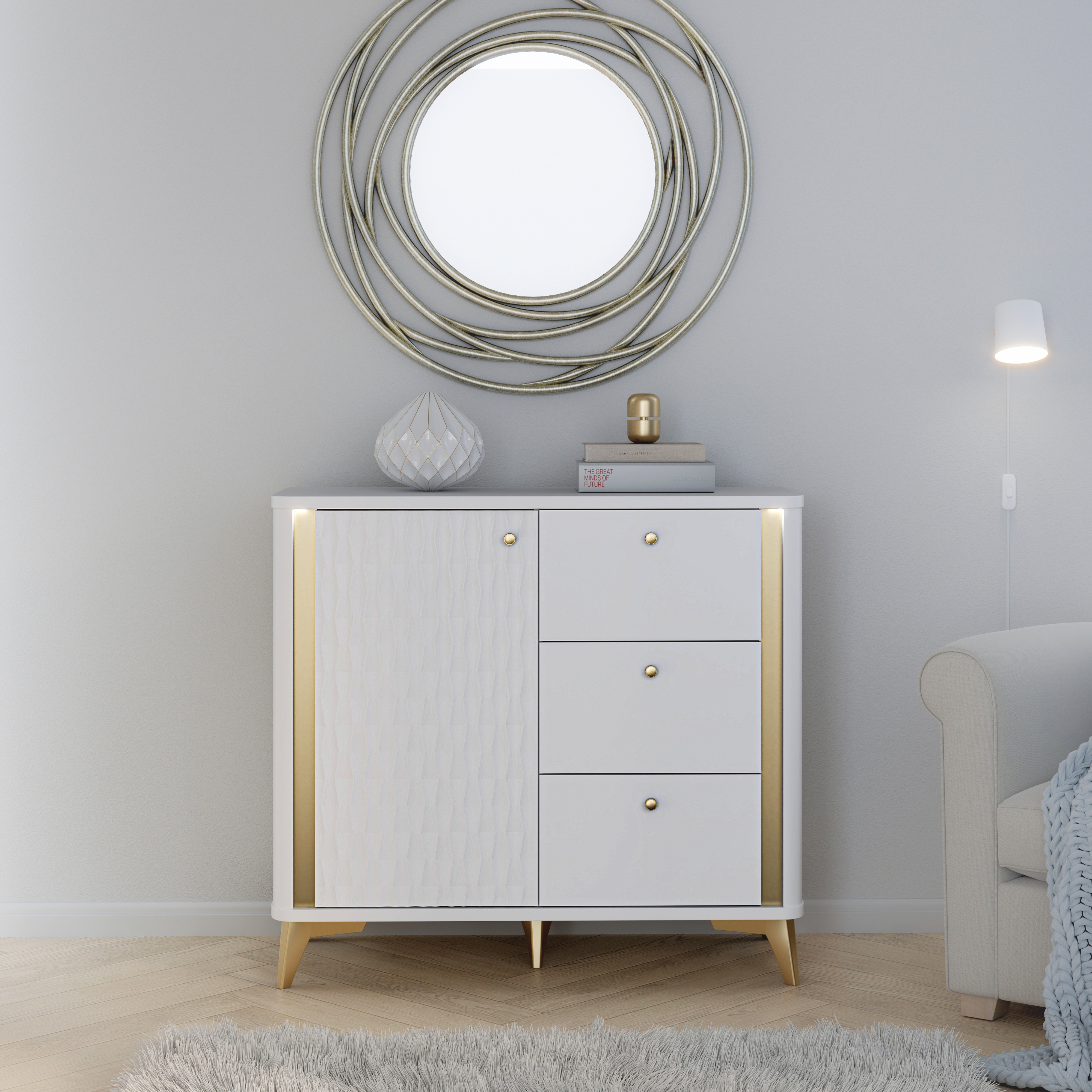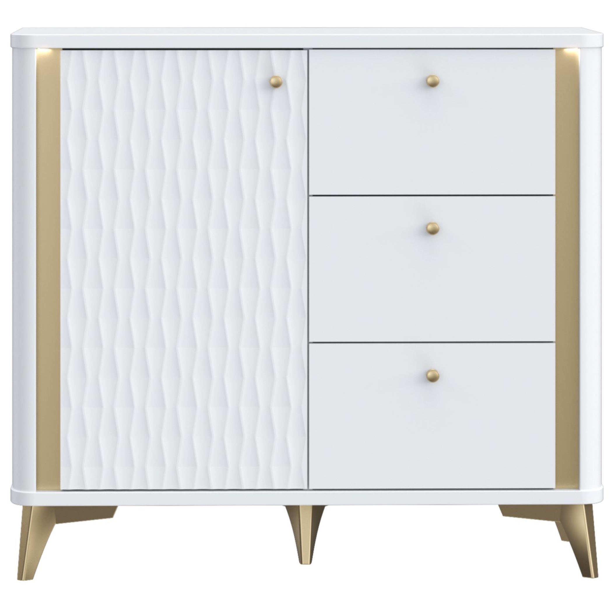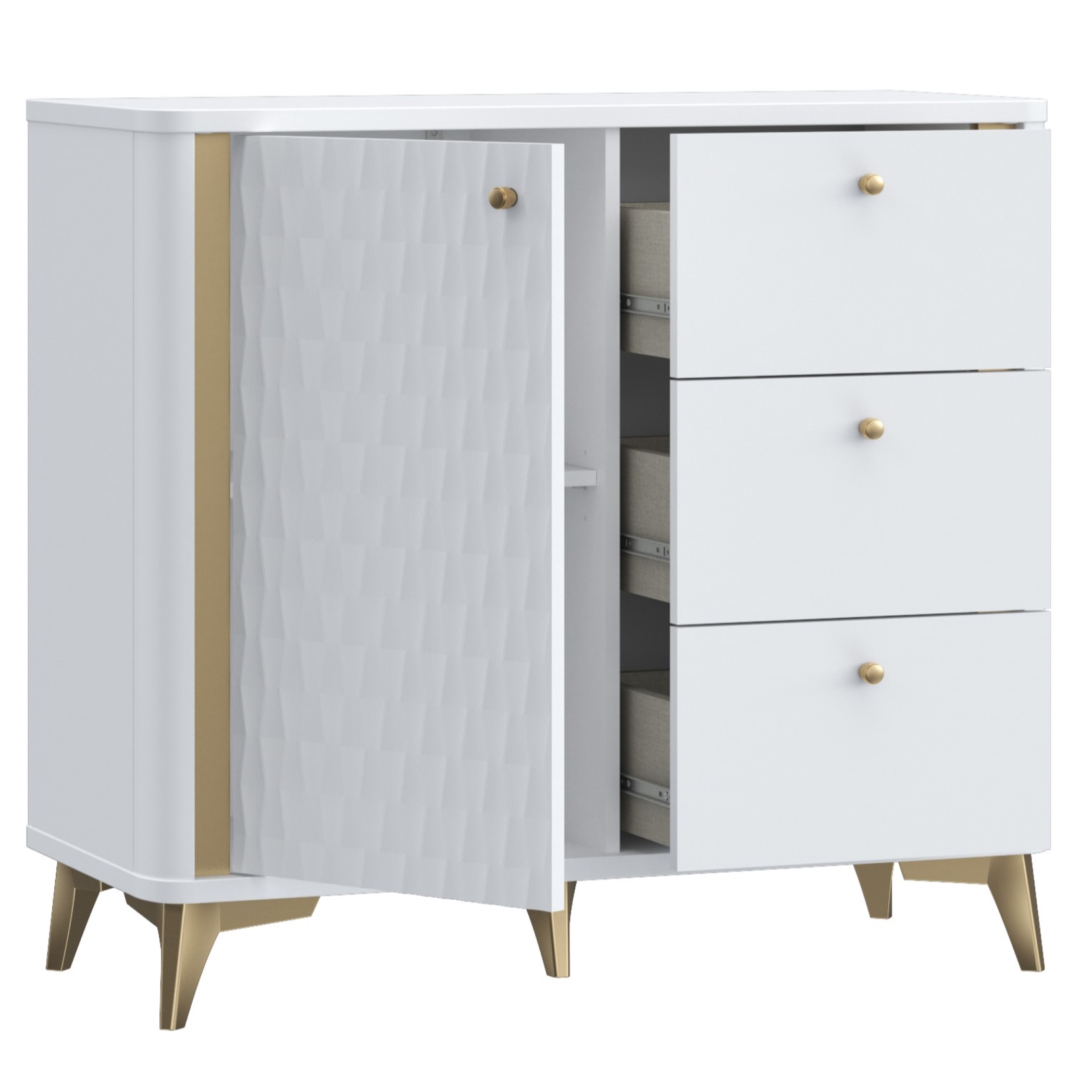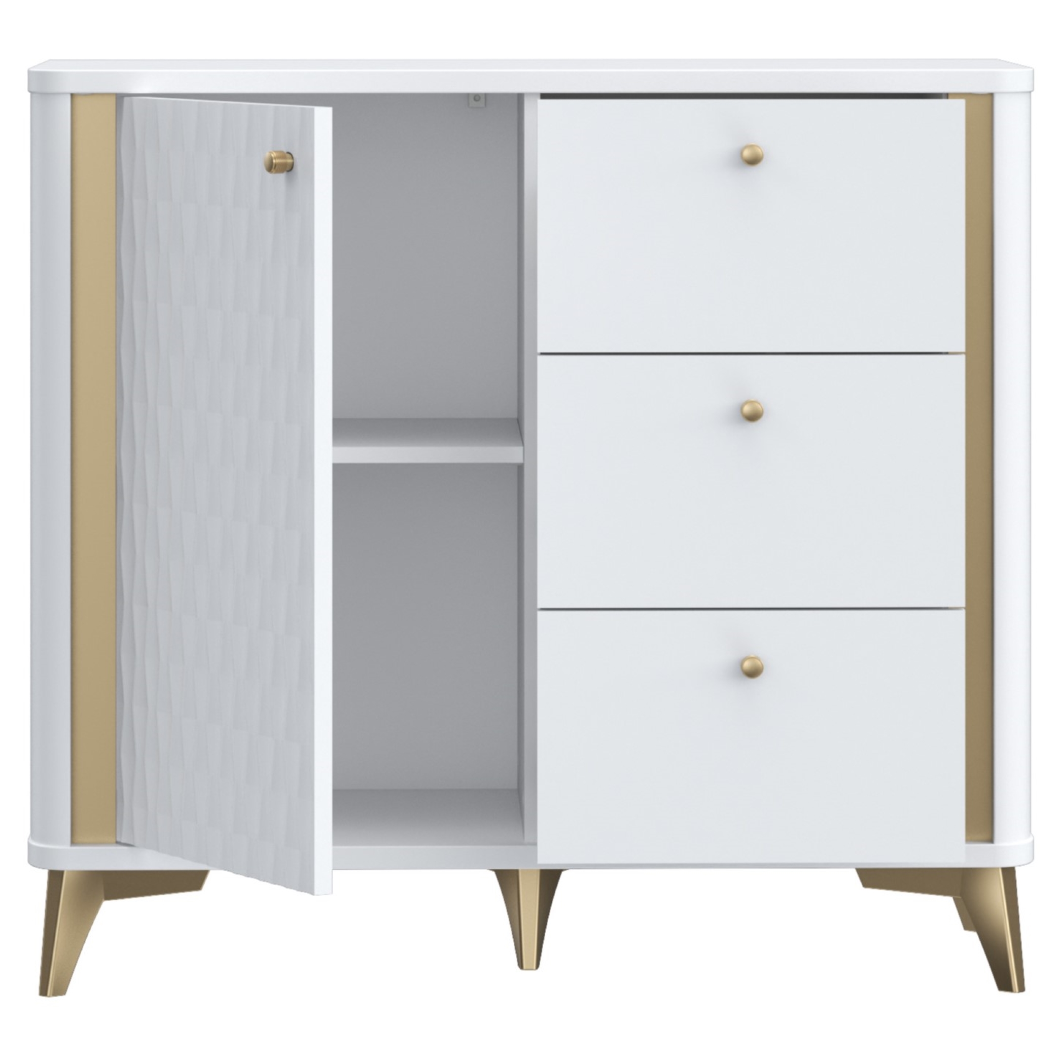 Uporabna komoda za spalnice ali predsobe, na voljo v prelepi kombinaciji bele barve z zlatimi poudarki in z zaobljenimi vogali za prijeten, mehkejši videz. Na levi strani ima kabinet s profiliranimi vratci in eno fiksno notranjo polico ki deli notranjost kabineta na dvoje. Zgornji prostor meri 33,7 cm v višino in 35 cm v globino, spodnji prostor pa 35,7 cm v višino ter 37,3 cm v globino. Desna stran komode ima tri enako velike predali na kovinskih vodilih. Predali so 12,6 cm visoki in 32,7 cm široki. Ročaji kabinetov in predalov so izdelani iz kovine v barvi zlata. Celotna komoda stoji na kompletu 12 cm visokih kovinskih nožic v ujemajoči zlati barvi.