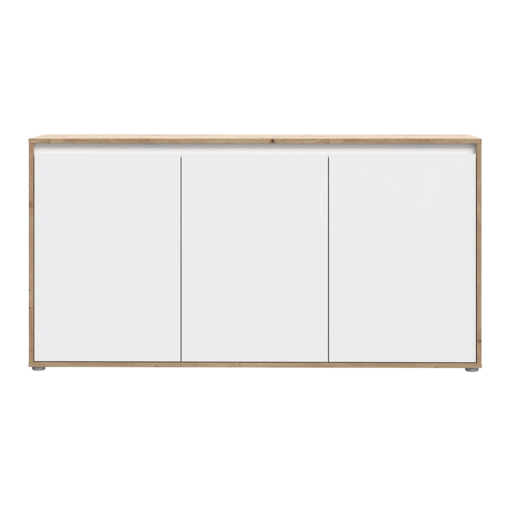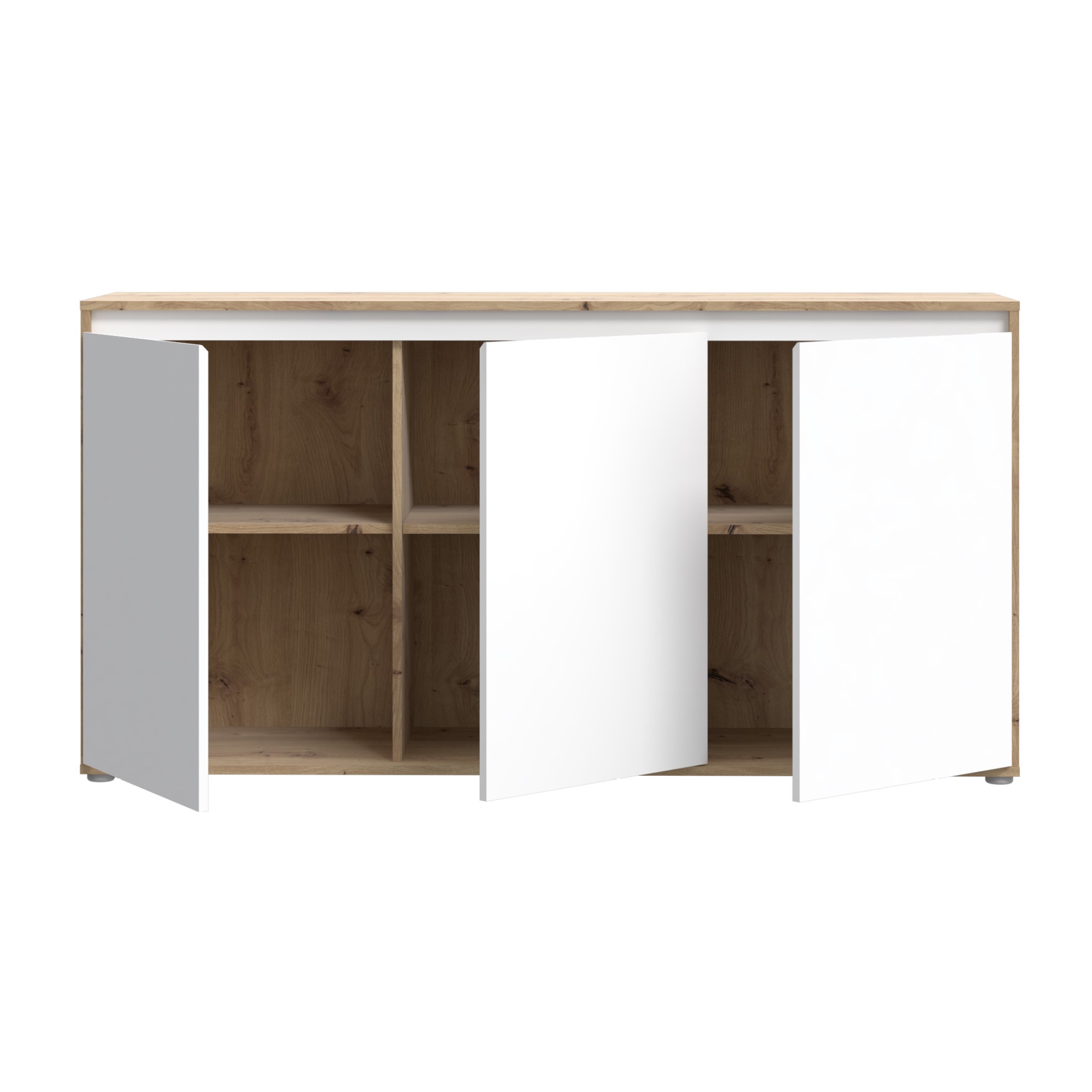 Za tremi vrati sta dva oddelka, vsak opremljen z eno polico, večji pa ima tudi vertikalno notranjo pregrado. Ne glede na to, ali je potreben prostor za jedilniško opremo, organizacijo pisarniških potrebščin ali samo vsakdanje predmete, ta komoda ponuja možnosti za dobro razvrstitev vaših stvari.