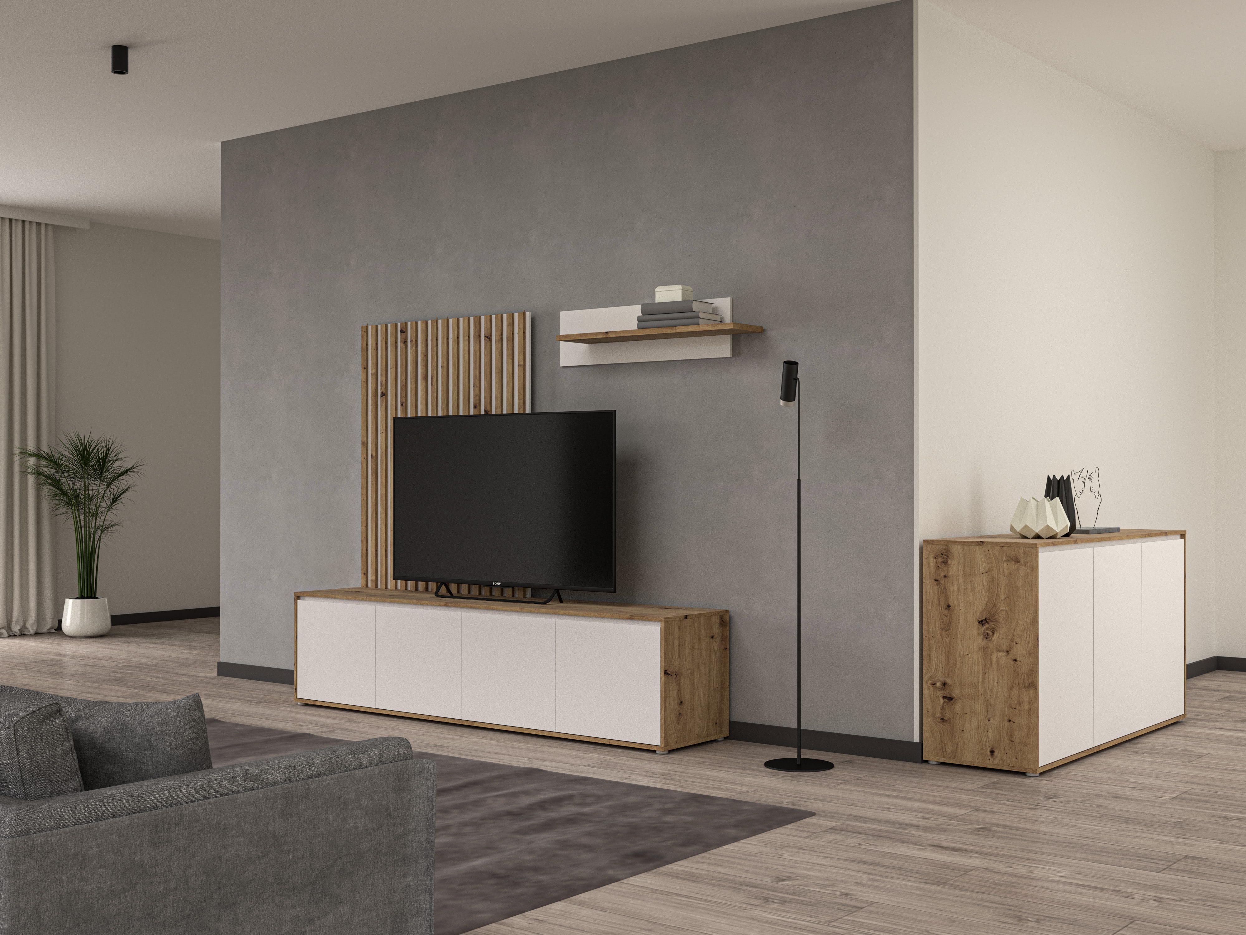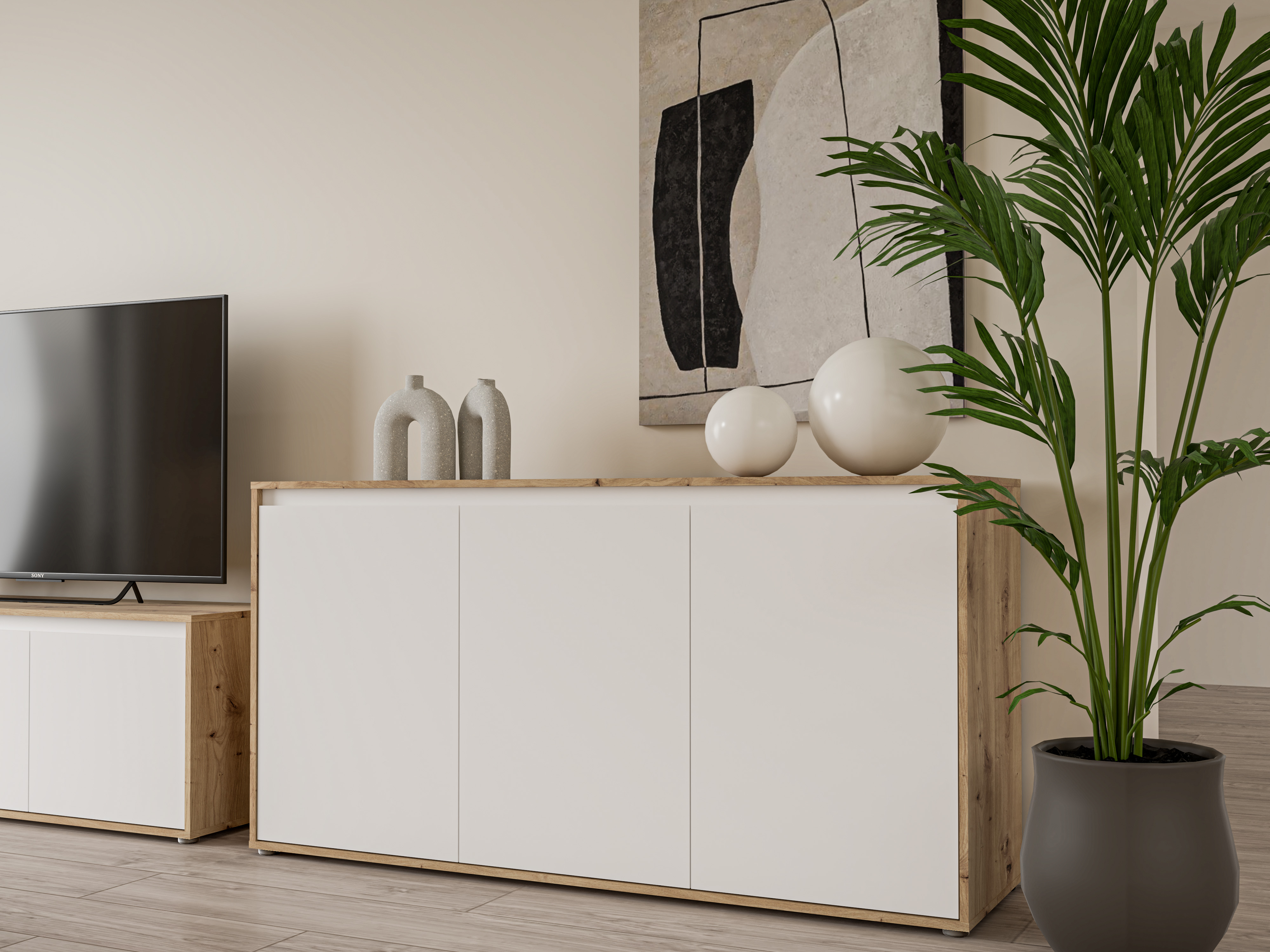 Sodobna komoda s tremi vrati, zasnovana tako, da v vaš prostor vnese tako stil kot funkcionalnost. Omarica ima minimalistično estetiko z dvobarvno paleto – bele fronte ter okvir v imitaciji sonoma hrasta.
