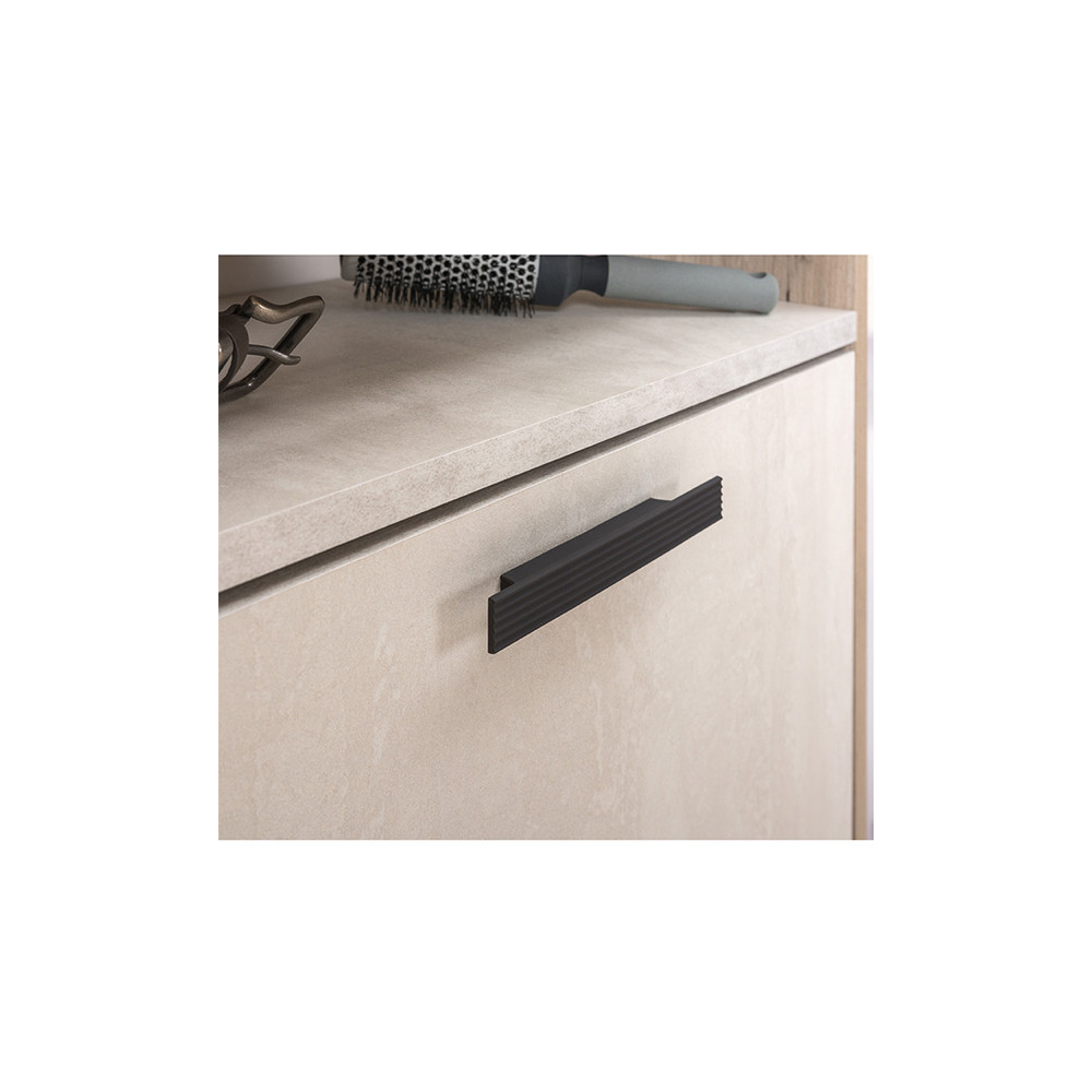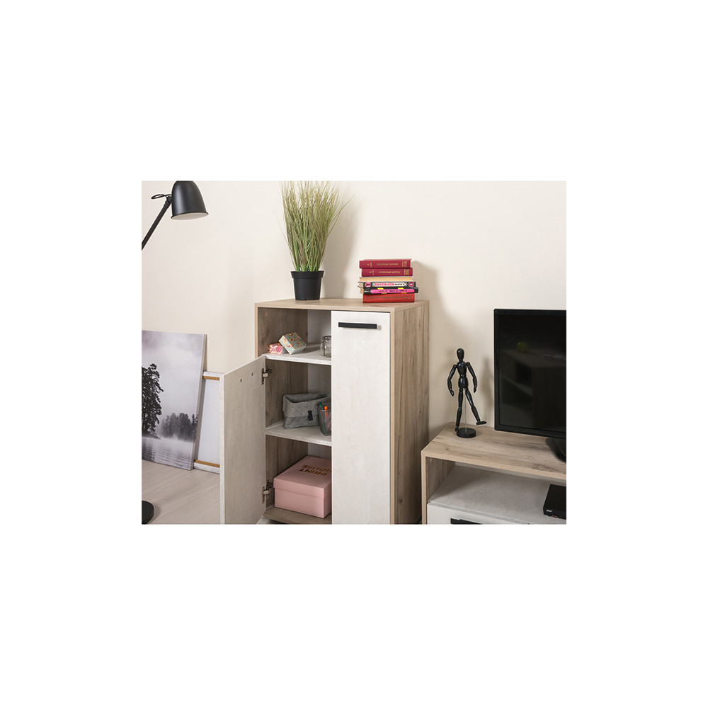 Moderna komoda v čudoviti kombinaciji bele barve in imitacije hrasta. Narejena je iz iverala, debeline 1,6 cm. Stoji na štirih plastičnih nogicah. Komoda ima dve različno veliki omarici, ki se odpirata s stilskim, kovinskim ročajem. Obe omarici imata v notranjosti eno nastavljivo polico, kateri lahko poljubno izbirate višino. Komodo lahko uporabljate v dnevni sobi, predsobi, spalnici, itd. Oglejte si še ostale izdelke iz istega programa.