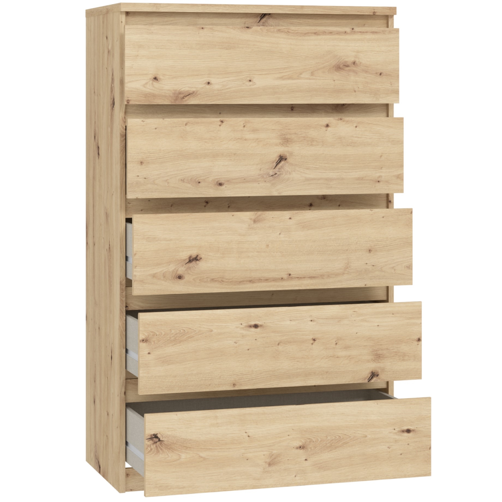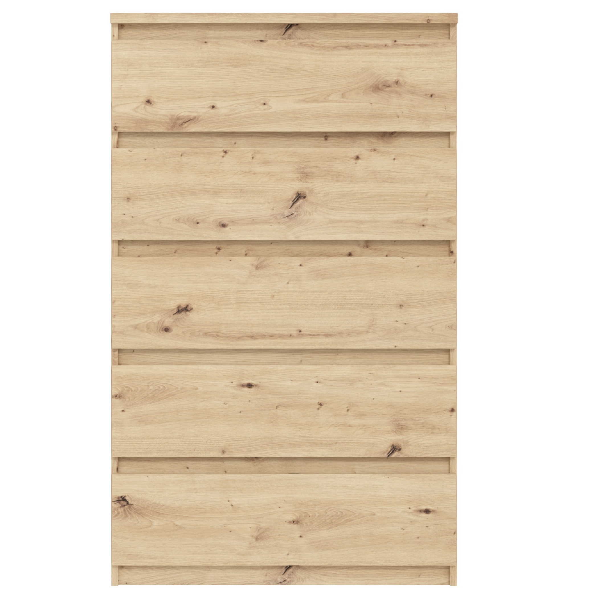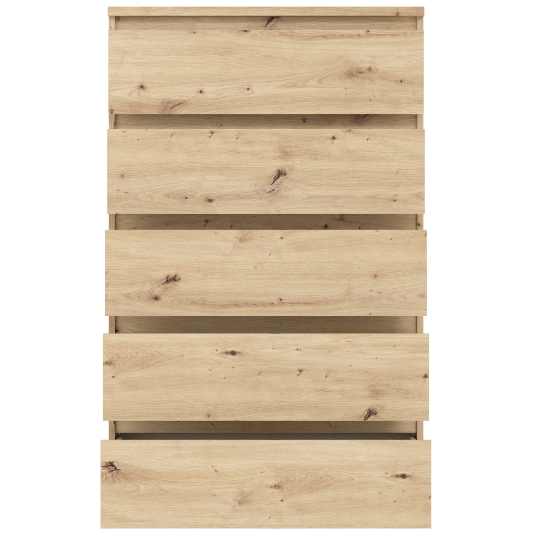 Visoka komoda s petimi predali brez ročajev, na voljo v povsem beli barvi ali barvi hrasta. V celoti je izdelana iz kakovostnega iverala, oblečenega v melamin za enostavno čiščenje in vzdrževanje.