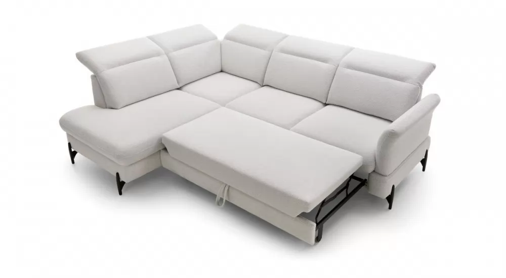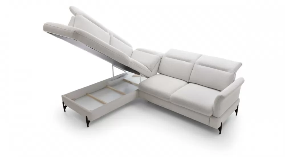 Moderna sedežna garnitura SIENNA 2 v obliki črke L. Garnitura se raztegne in ponuja ležišče, dimenzije 125x192cm. Pod krakom garniture se nahaja tudi prostoren predal. Garnitura stoji na modernih kovinskih nogicah, kar omogoča enostavnejše čiščenje. Nastavljivi vzglavniki so vključeni v ceno garniture. Za svojo garnituro lahko izbirate med različnimi tkaninami in barvami. Prav tako lahko izberete levo ali desno postavitev garniture. Garnitura je kvalitetne izdelave, oblazinjena z visokokakovostno peno v kombinaciji z valovitimi vzmetmi.