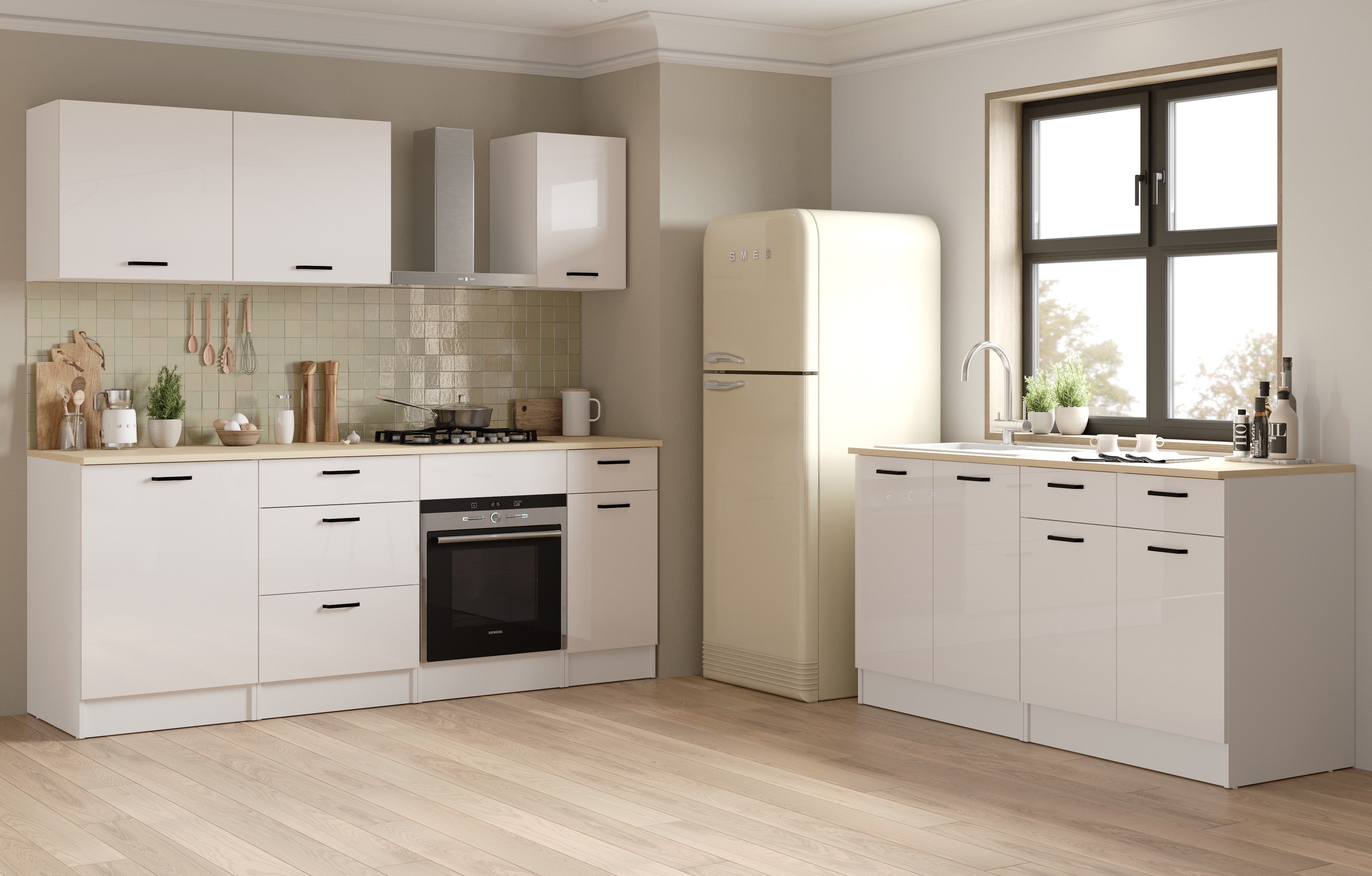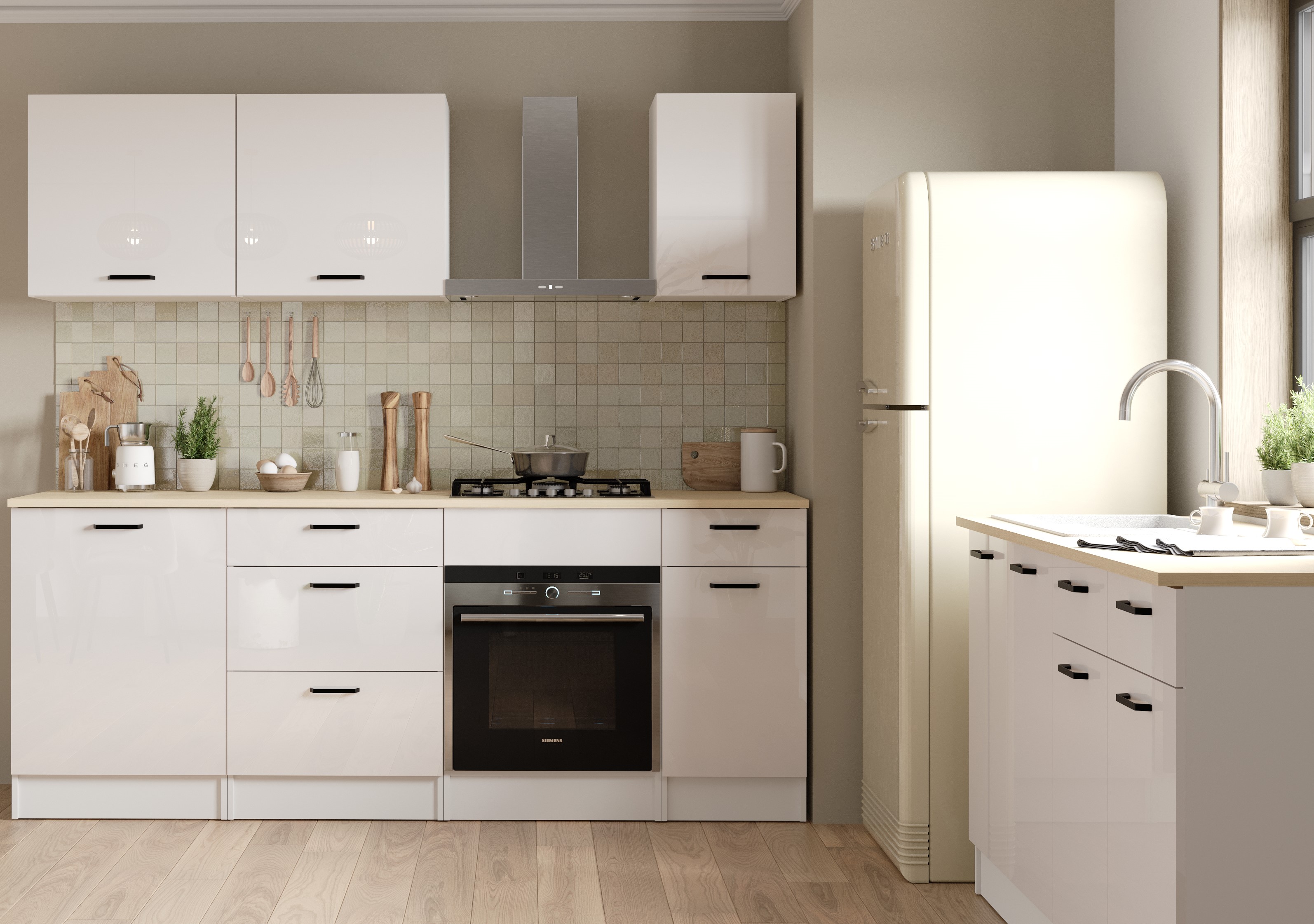 Fronte so prevlečene z visokosijajnim polarno belim lakom, kar ustvarja svetlo, odsevno površino, ki poudarja čist in sodoben videz kuhinje, hkrati pa še vizualno povečuje prostor z odbojem naravne in umetne svetlobe.