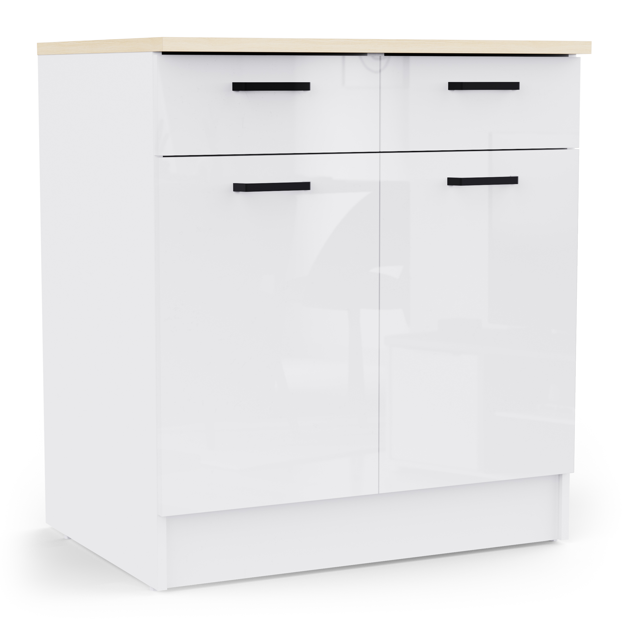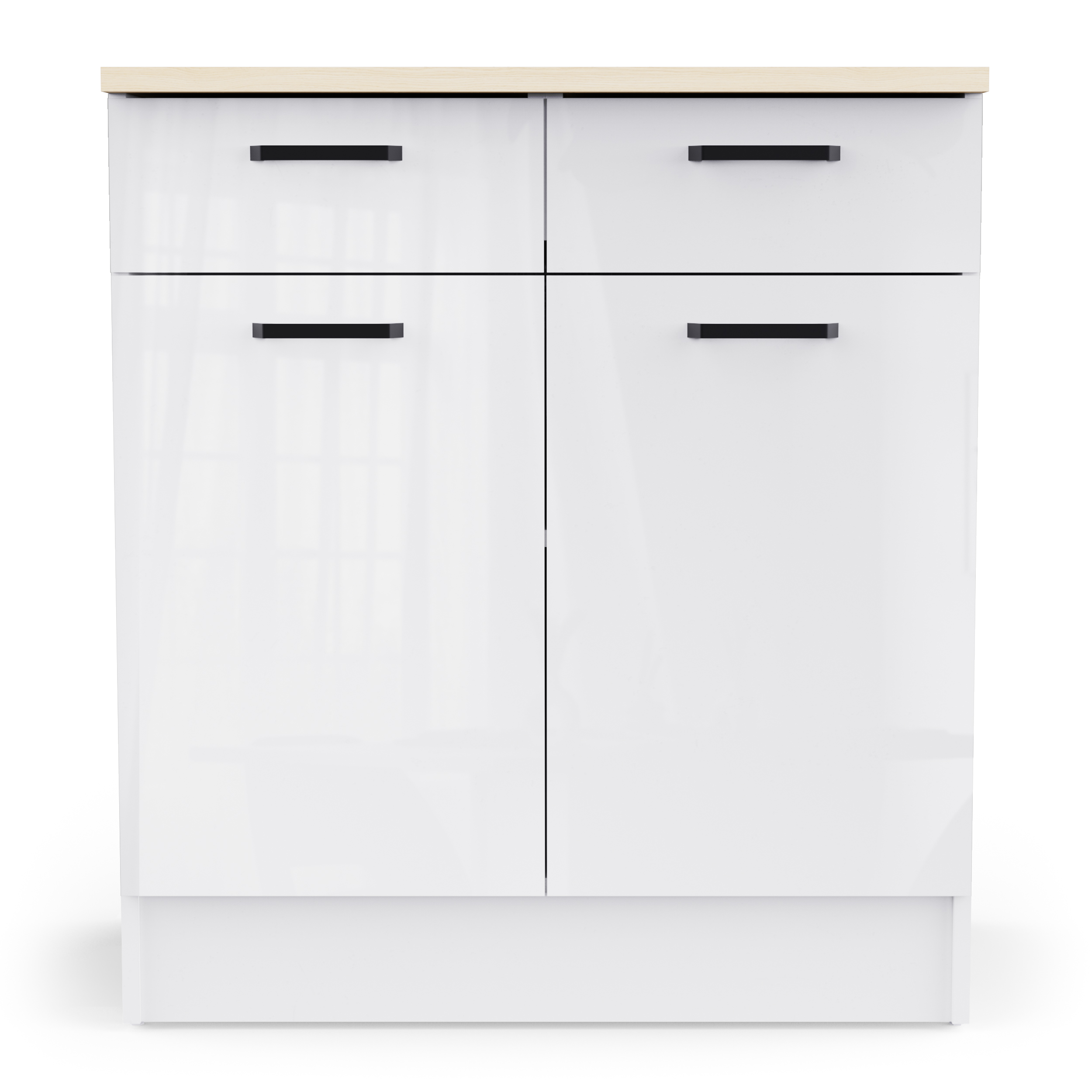 Tako vrata kot predali so opremljeni s črnimi aluminijastimi ročaji, ki izstopajo na sijajnih belih sprednjih straneh. Za večje udobje in vzdržljivost so vrata in predali opremljeni tudi z vgrajenimi blažilniki za mehko zapiranje, ki zagotavljajo tiho delovanje, preprečujejo loputanje in podaljšujejo življenjsko dobo omarice.