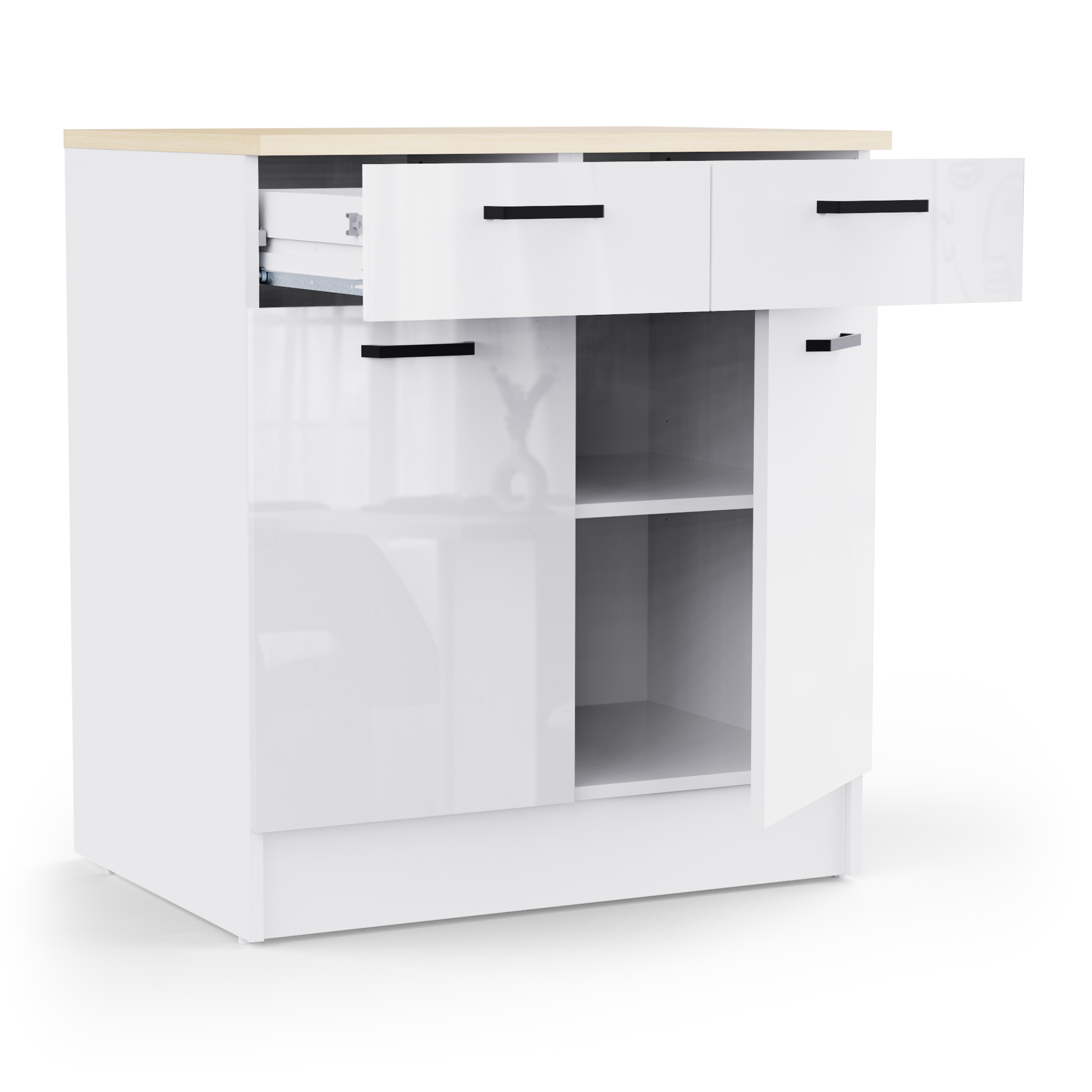 Pod predali je prostoren kabinet z dvemi vrati na tečajih. V notranjosti je ena široka polica, velikosti 77x50 cm. To polico je mogoče nastaviti na tri različne višine, kar ponuja prilagodljivo shranjevanje večjih predmetov, kot so lonci, servirni krožniki ali majhni gospodinjski aparati. Nastavljivost omogoča prilagoditev notranjega prostora glede na spreminjajoče se potrebe po shranjevanju.