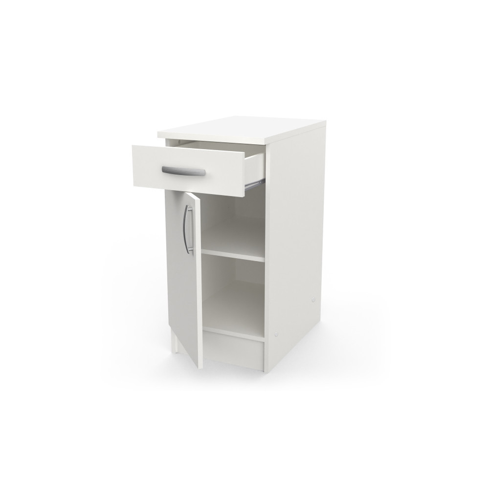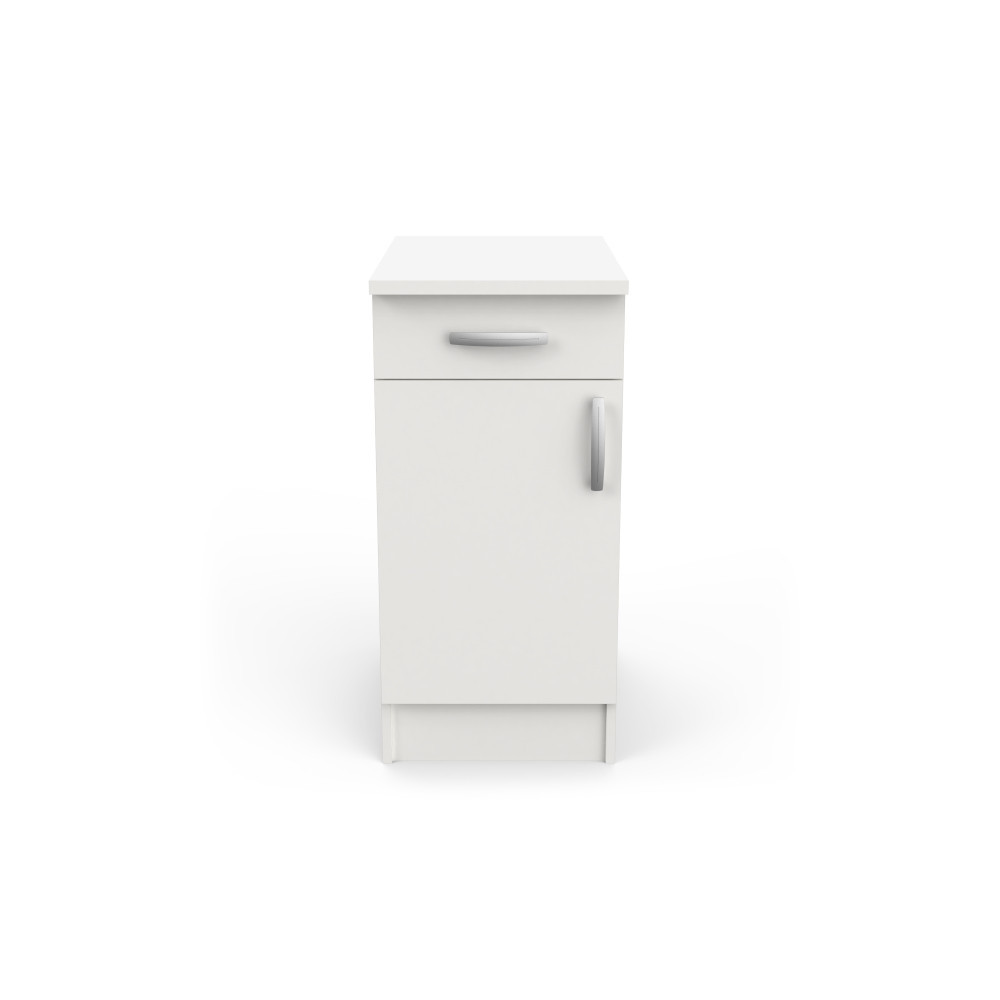 Moderna kuhinjska talna enota v vodoodporni beli barvi. Nevtralna barva in diskreten dizajn omogočata da se element prilega vsakemu dekorju. Enota je narejena iz 100% melamina. Opremljena je z enim predalom na kovinskih vodilih z valjčki, velikost 37x32x9 cm in velikim prostorom z nastavljivo polico, ki se odpira z vratci. Polica je nastavljiva na tri različne nivoje in ima površino 37x52 cm. Vgrajeno namizje je debelo 2,2 cm in globoko 60 cm. Ta vrsta različnih načinov za shranjevanje bo zlahka sprejela raznorazne kuhinjske pripomočke ali hrano. Oglejte si še druge izdelke iz istega programa.
