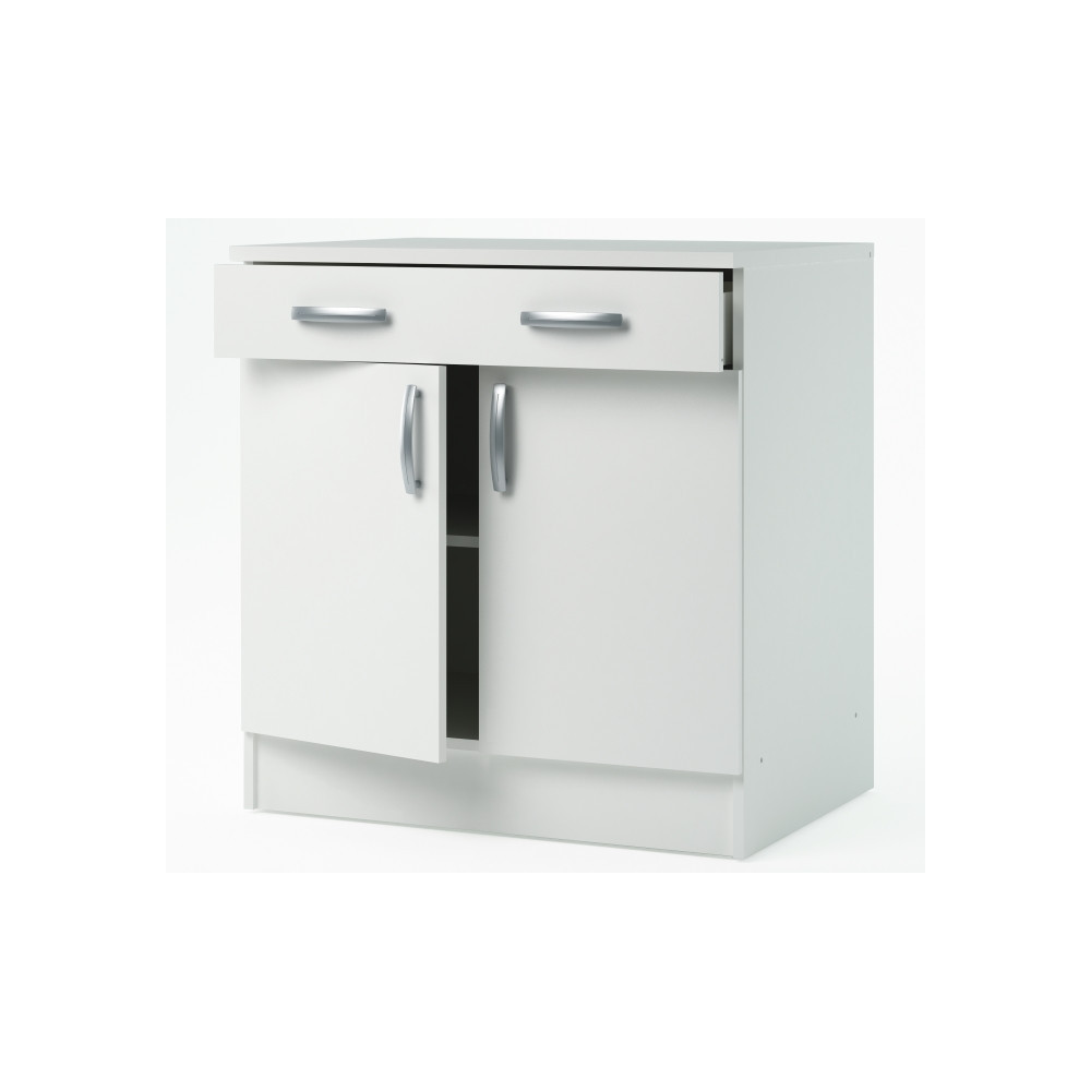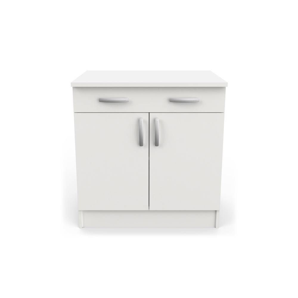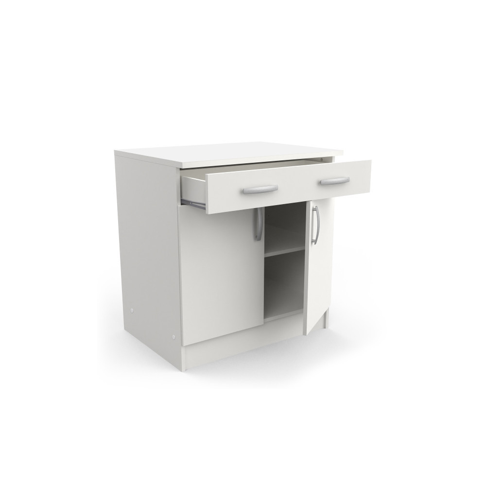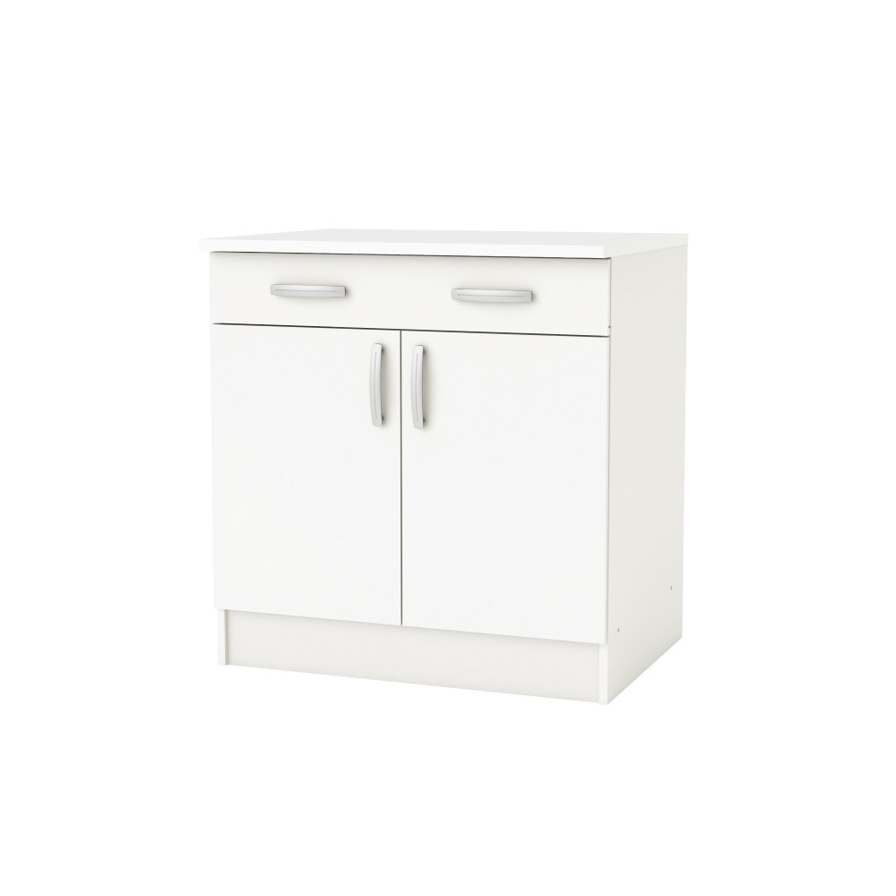 Moderna kuhinjska talna enota v vodoodporni beli barvi. Nevtralna barva in diskreten dizajn omogočata da se element prilega vsakemu dekorju. Enota je narejena iz 100% melamina. Opremljena je z enim širokim predalom na kovinskih vodilih z valjčki, velikost 37x72x9 cm in velikim prostorom z nastavljivo polico, ki se odpira z dvojnimi vratci. Polica je nastavljiva na tri različne nivoje in ima površino 77x52 cm. Vgrajeno namizje je debelo 2,2 cm. Ta vrsta različnih načinov za shranjevanje bo zlahka sprejela raznorazne kuhinjske pripomočke ali hrano. Oglejte si še druge izdelke iz istega programa.