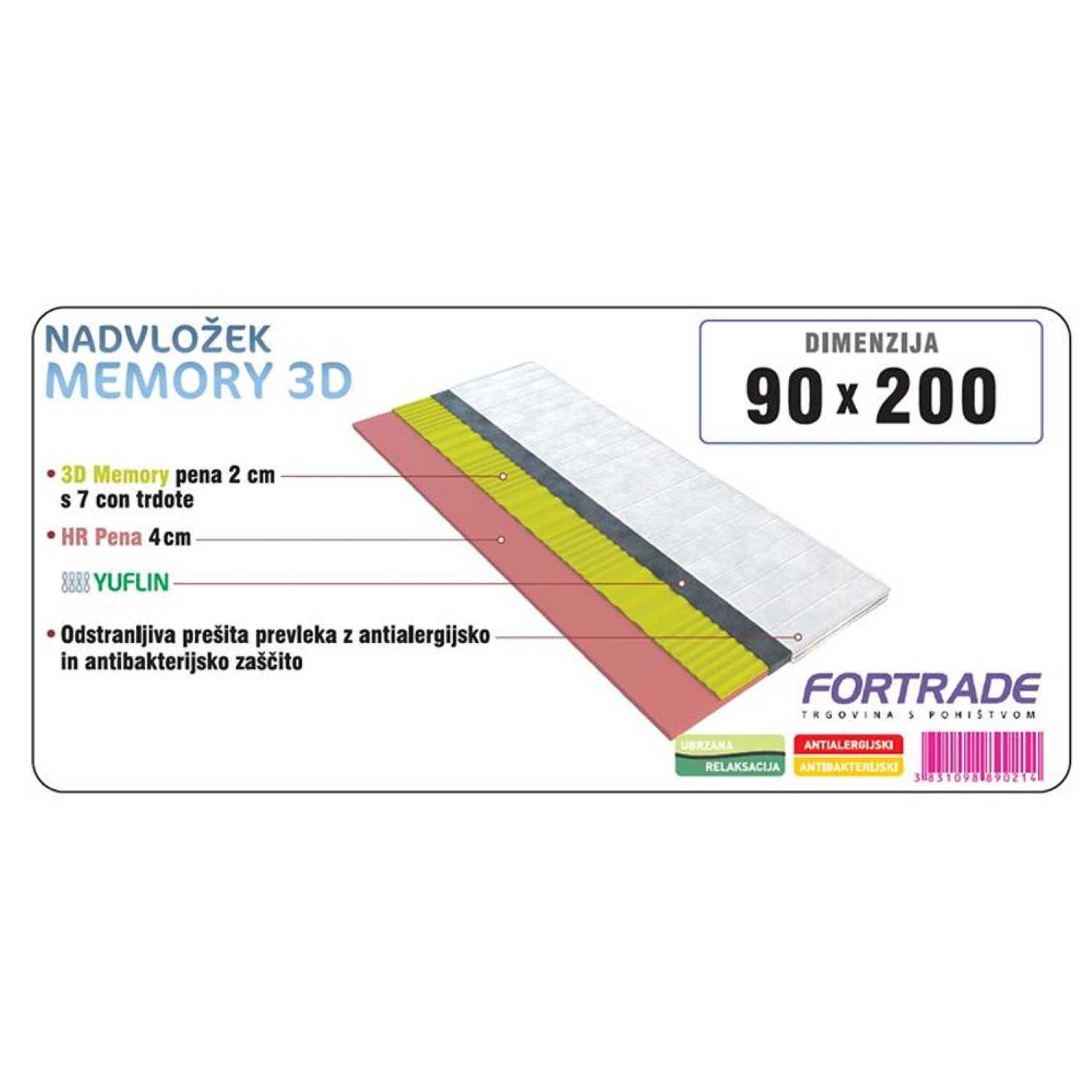 Sodoben nadvložek z jedrom iz 2 cm debele plasti spominske pene s 7 conami trdote in 4 cm plasti HR pene spremeni vašo obstoječo posteljo v izjemno udobno in mehko mesto za spanje. Zaradi kombininiranih lastnosti sestavnih pen je ta nadvložek čvrst in odporen na deformacije, zagotavlja odlično ortopedsko oporo ter hkrati zagotavlja optimalno temperaturo in klimo za spanje. MEMORY pena se kot odziv na temperaturo in pritisk telesa prilagodi obliki telesa, razbremeni napetosti in tako omogoči občutek sproščenosti, potreben za kakovosten spanec. Plasti pene so zavite v YUFLIN materijal. Zunanje pokrivalo je izdelano iz antibakterijsko in antialergijsko obdelane tkanine ki zagotavlja zaščito pred klicami in razvojem bakterij ter plesni, kar hkrati tudi poveča kakovost in vzdržljivost prevleke.