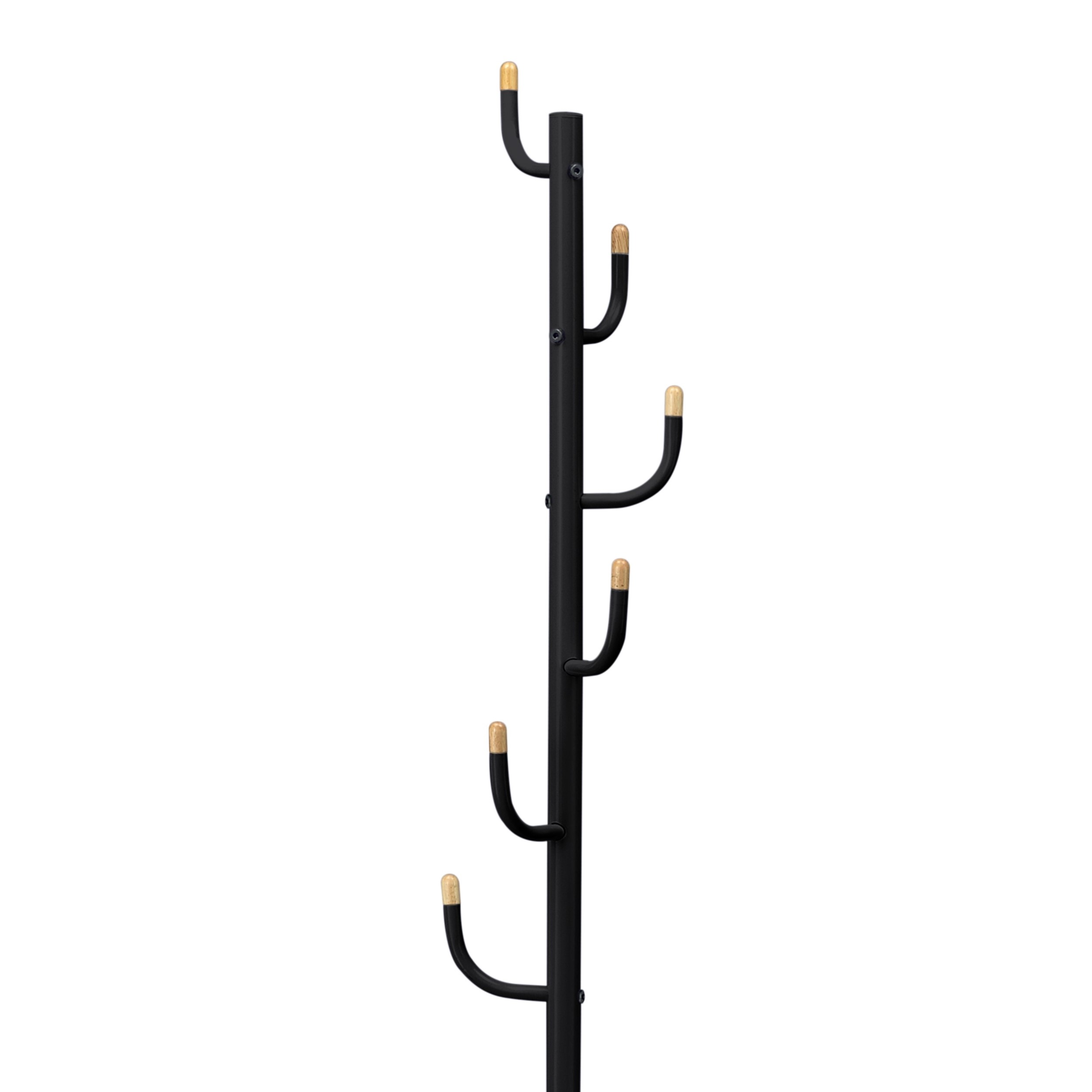 Opremljeno je s šestimi kljukami, ki so razporejene na različnih višinah za optimalno izrabo prostora. Vsaka kljuka ima konco iz lesa, v svoji naravni barvi,  kar hkrati ščiti oblačila pred poškodbami in obenem doda topel, naraven poudarek kovinski konstrukciji.