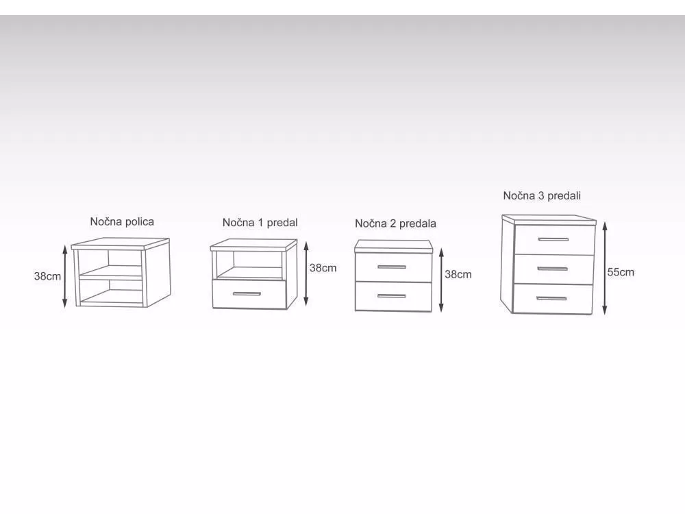 Dolžina nočne omarice je 43cm, globina 37cm ter višina 38cm ali 55cm (tremi predali)