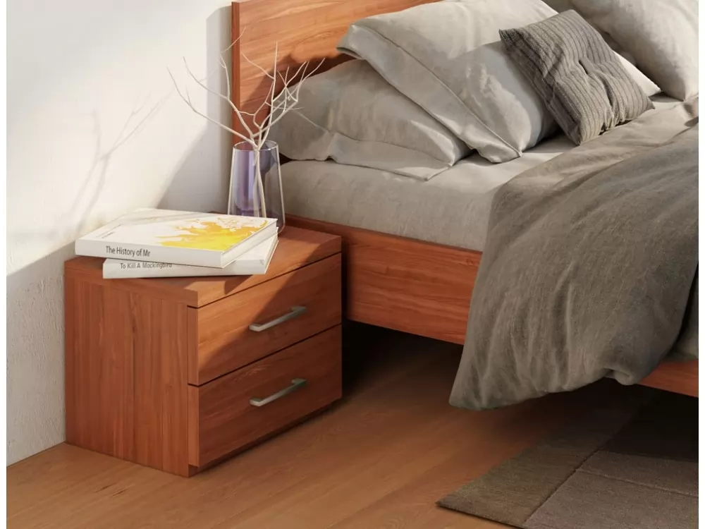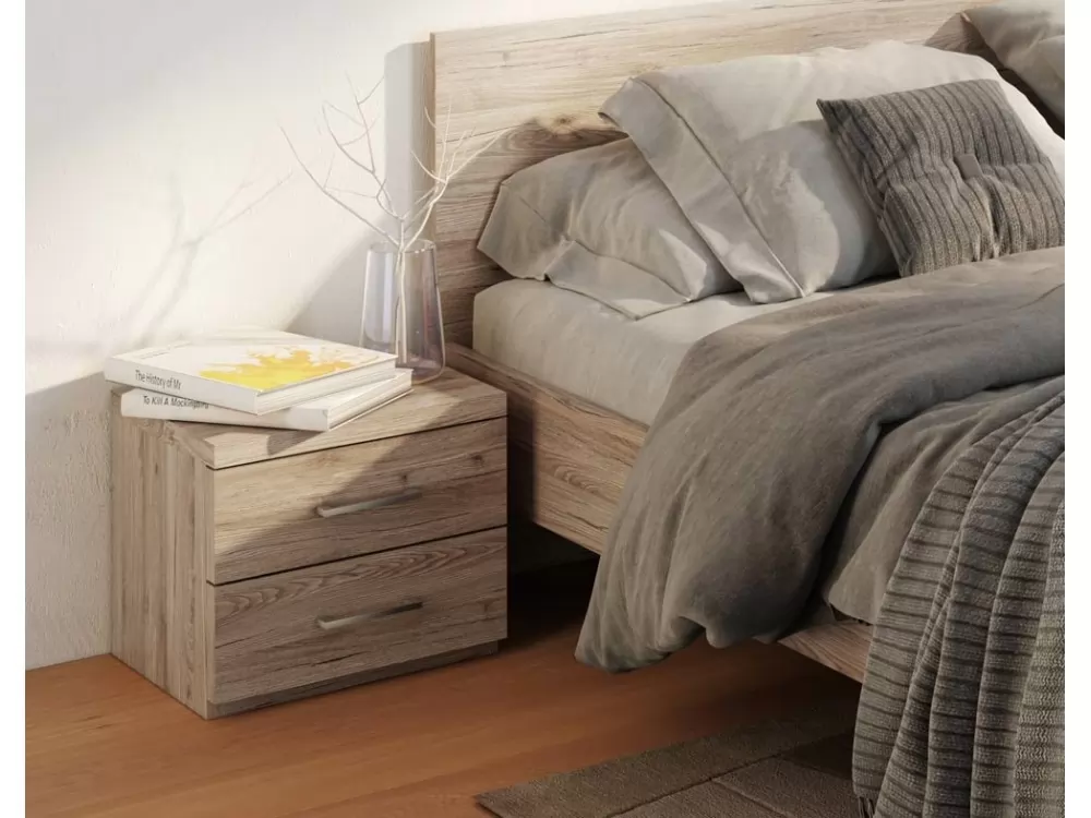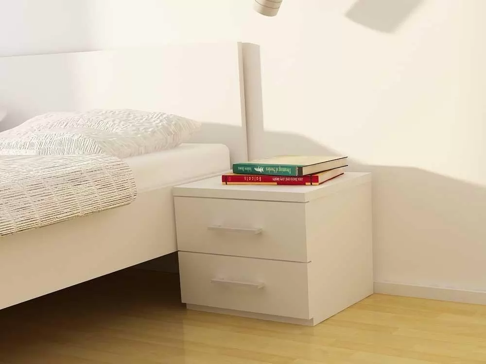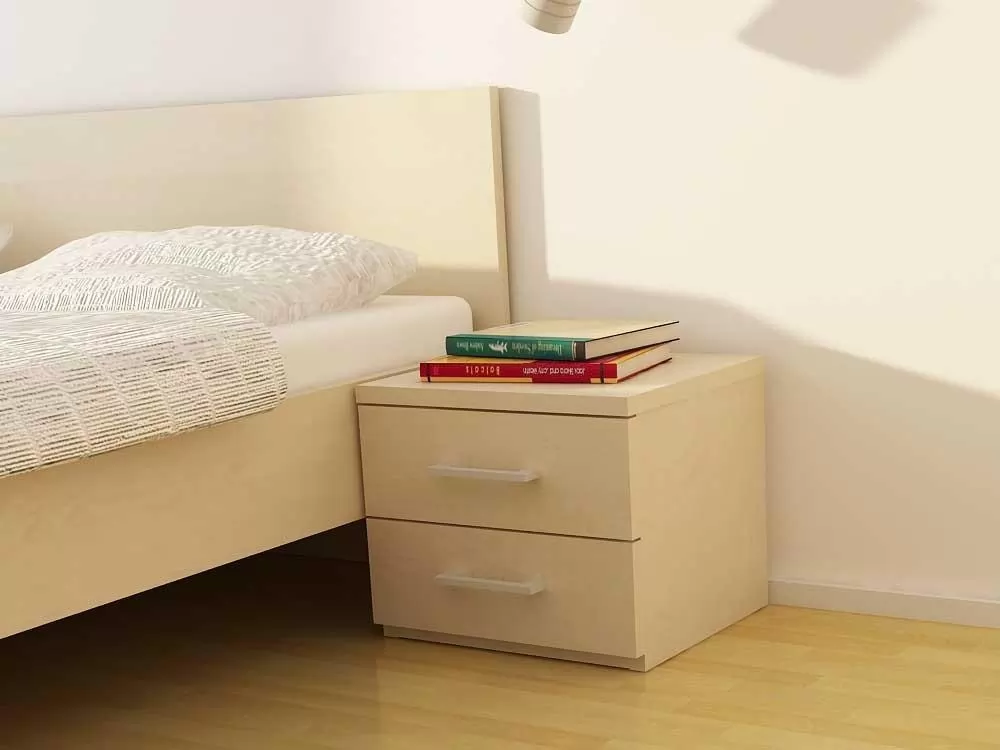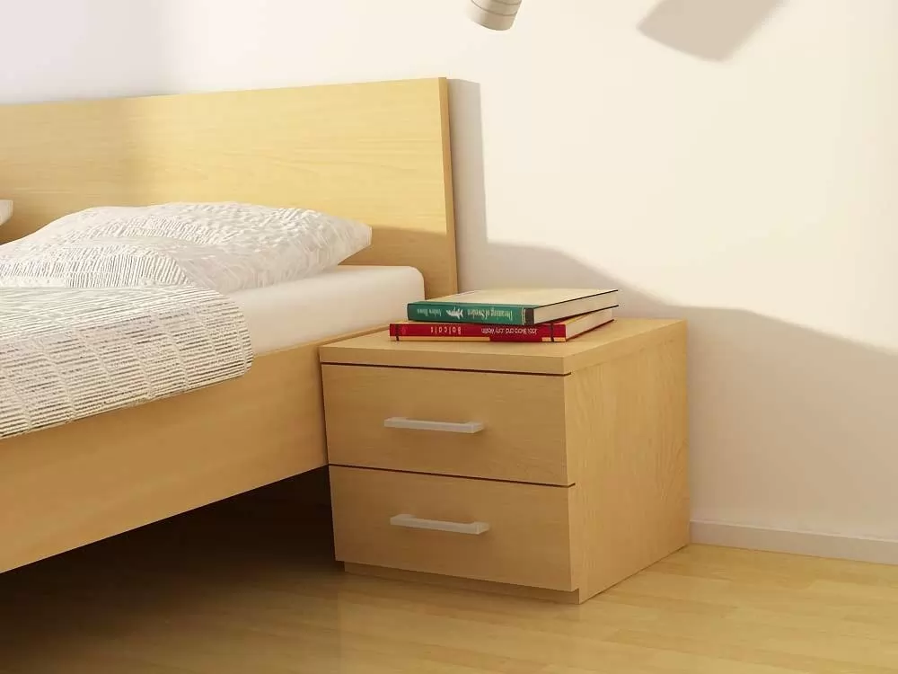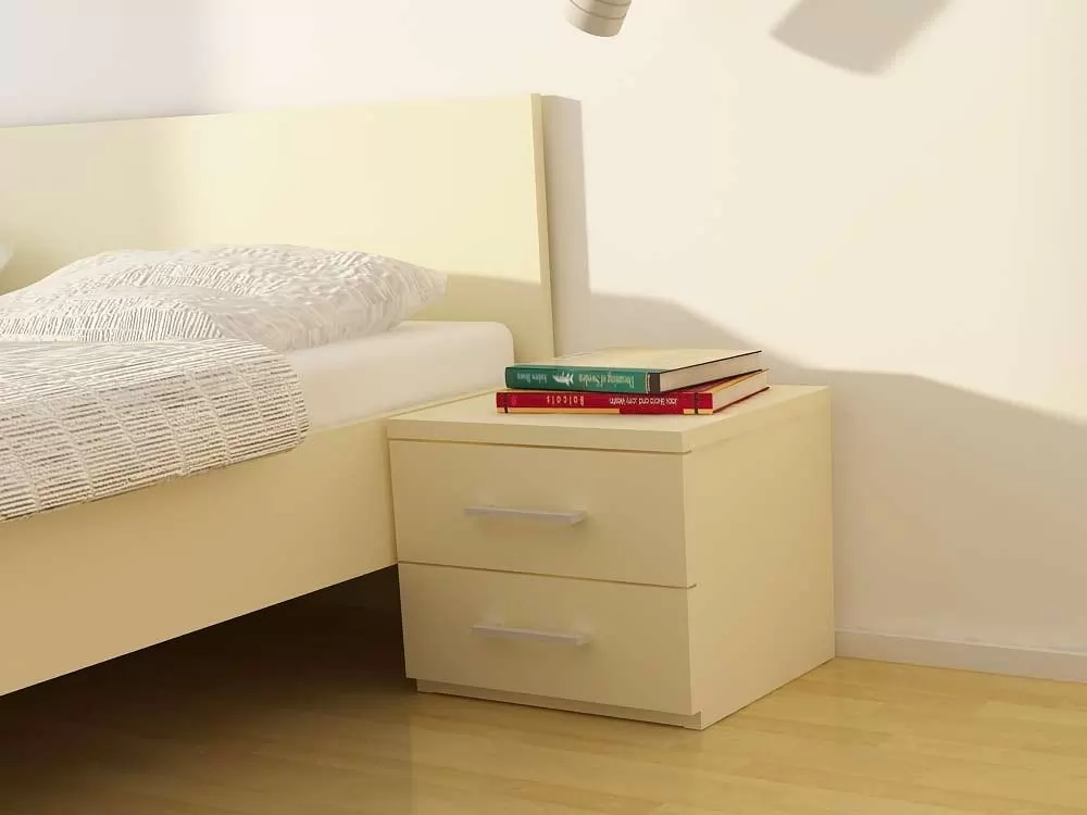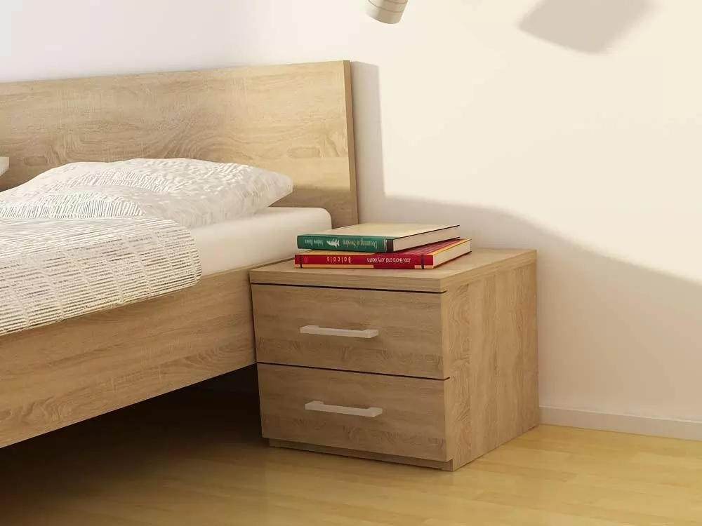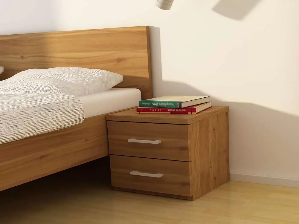 Nočna omarica je izdelane iz oplemenitenega iverala debeline 25mm in zaključena z ABS robovi. Predali se odpirajo s pomočjo kovinskih vodil ter kovinskega ročaja. Na razpolago opcije: