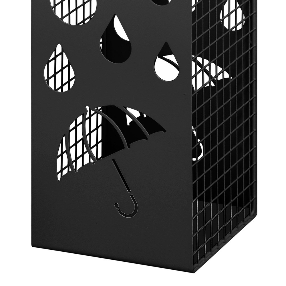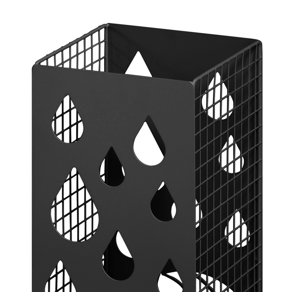 Praktičen koš za dežnike, ki se s svojo kvadratno obliko tesno prilega v vse kote. V celoti je izdelan iz jeklene žice in tankih jeklenih plošč, prašno lakiranih v črno barvo za boljšo zaščito. To prosto stoječe stojalo lahko uporabite pri vhodu ali na hodniku vašega doma, stanovanja ali pisarne. Uporablja se lahko za odlaganje in organizacijo vaših dežnikov, sprehajalnih palic in drugih pripomočkov. Z okrašenimi stranicami bo videti odlično tudi kot preprost dekorativni element in hkrati tudi trdno držalo vaše dežnike.