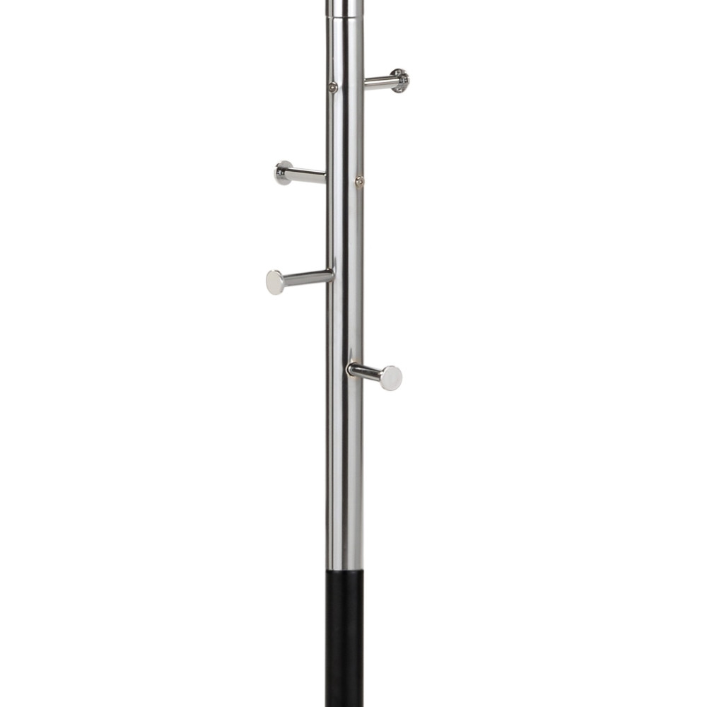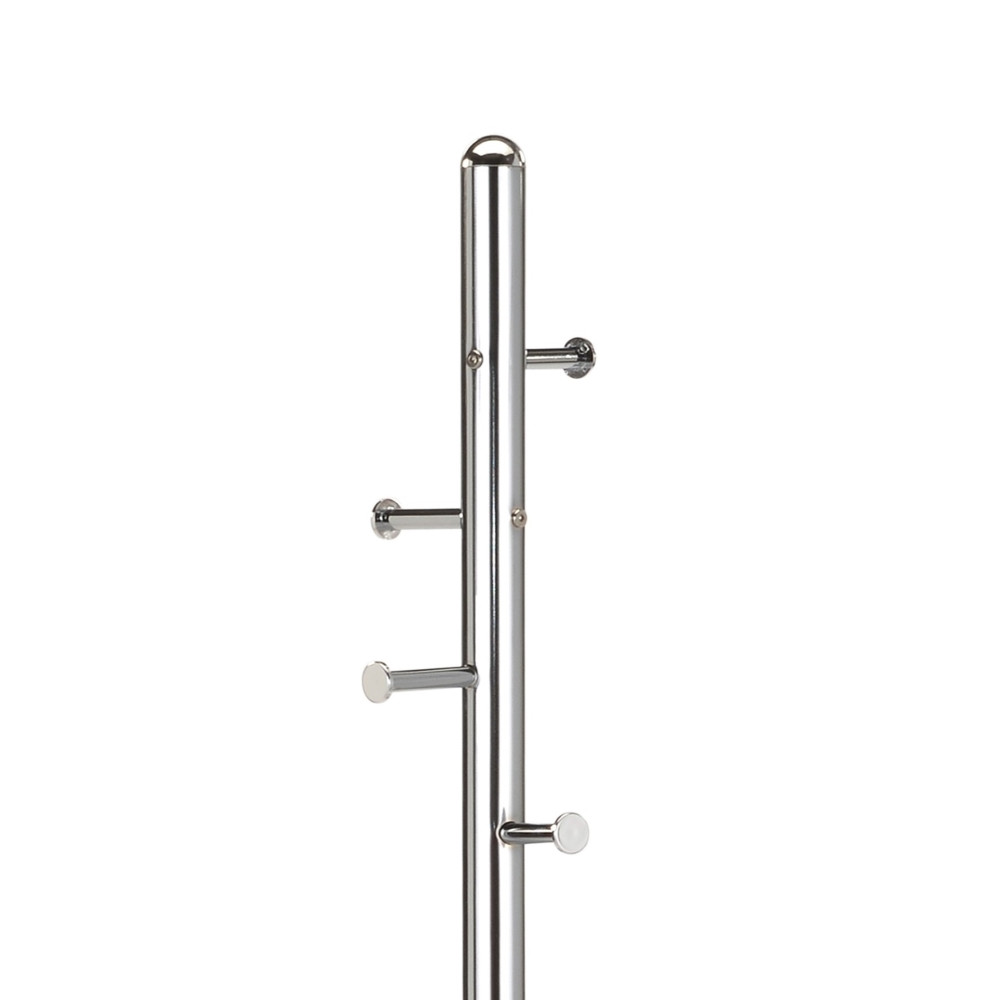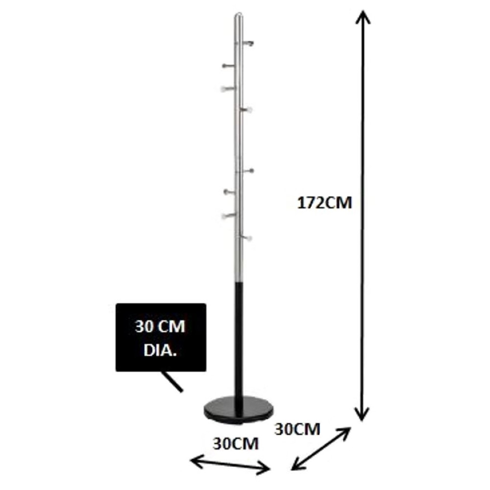 Sodoben obešalnik za plašče, jakne, torbice, klobuke... Obešalnik ima 8 kovinskih kljukic, vsaka od njih lahko nosi do 2 kg, za skupno nosilnost do 16 kg. Obešalnik je izdelan iz kovinske cevi, višine 172 cm, s krom finišem v zgornjem delu, spodnji del stebra ter talna plošča pa so prašno lakirani s črno barvo. Okrepljena talna plošča ima premer 30 cm in zagotavlja dobro stabilnost tudi ko je obešalnik obtežen.
