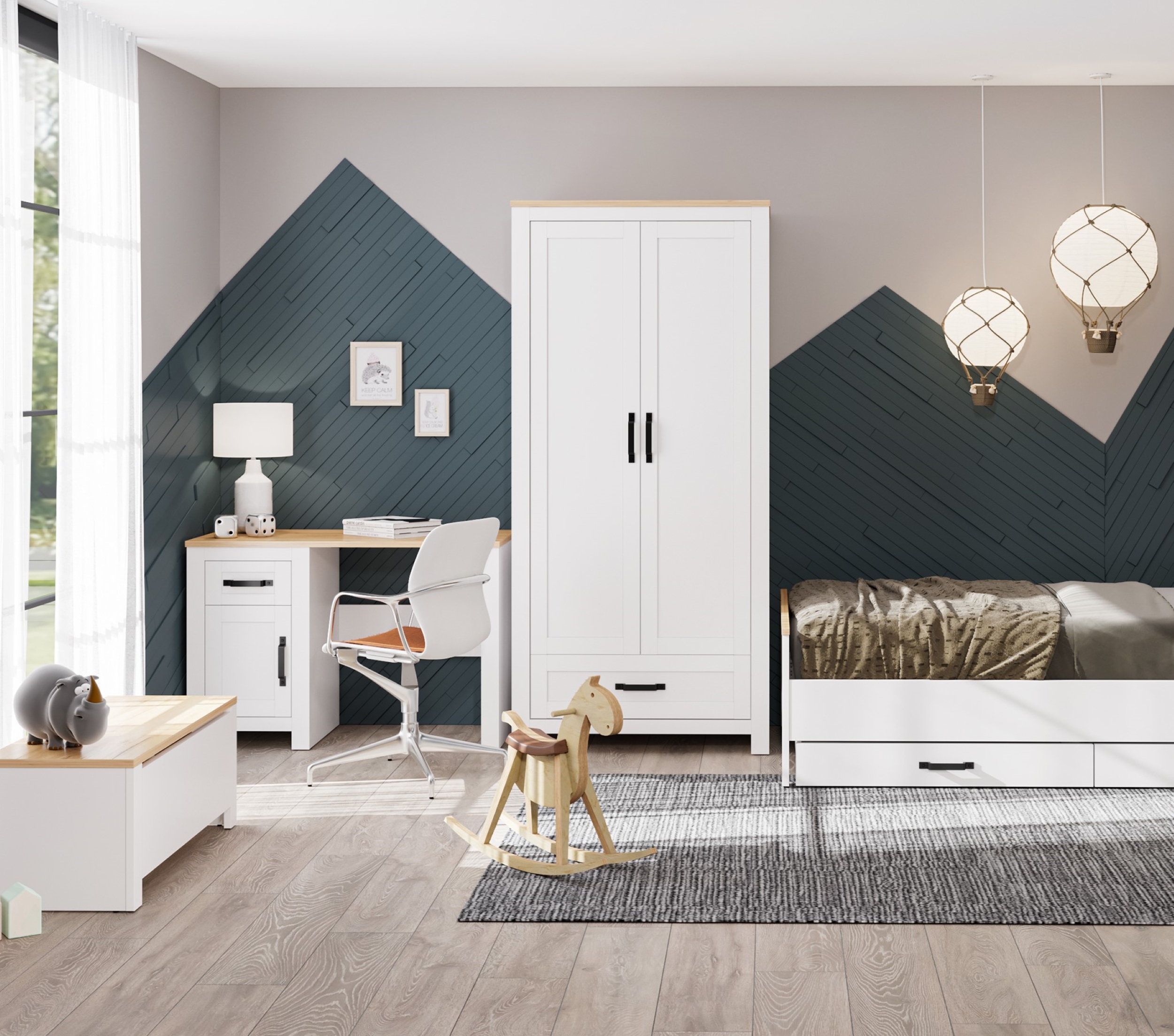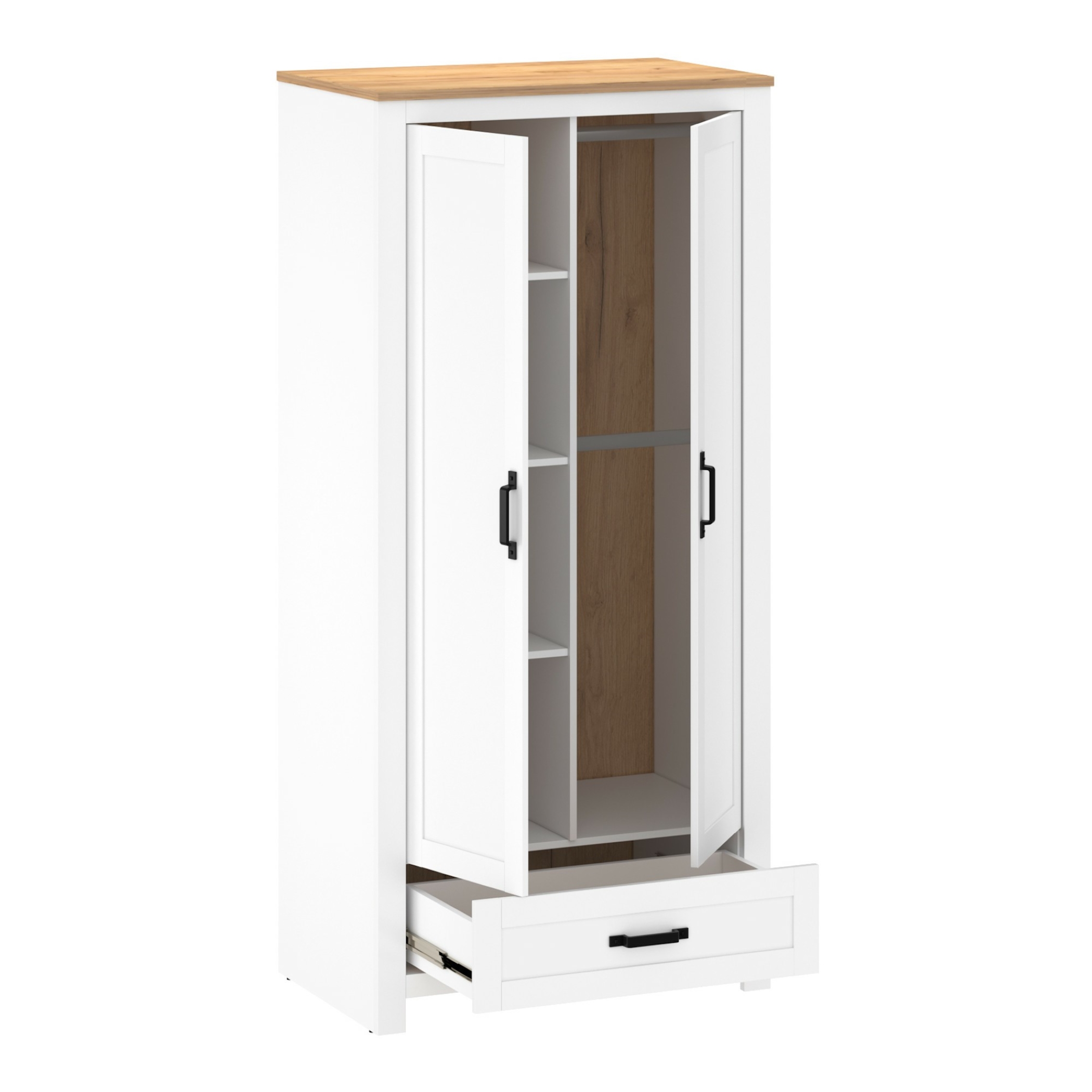 Visoka garderobna omara z dvemi vrati in predalom, na voljo v kombinaciji hrasta in bele barve. Dizajn omogoča učinkovito organiziranje oblačil, obutve in drugih dodatkov ter zagotavlja, da je vse, kar potrebujete, lahko dostopno, preden stopite ven.