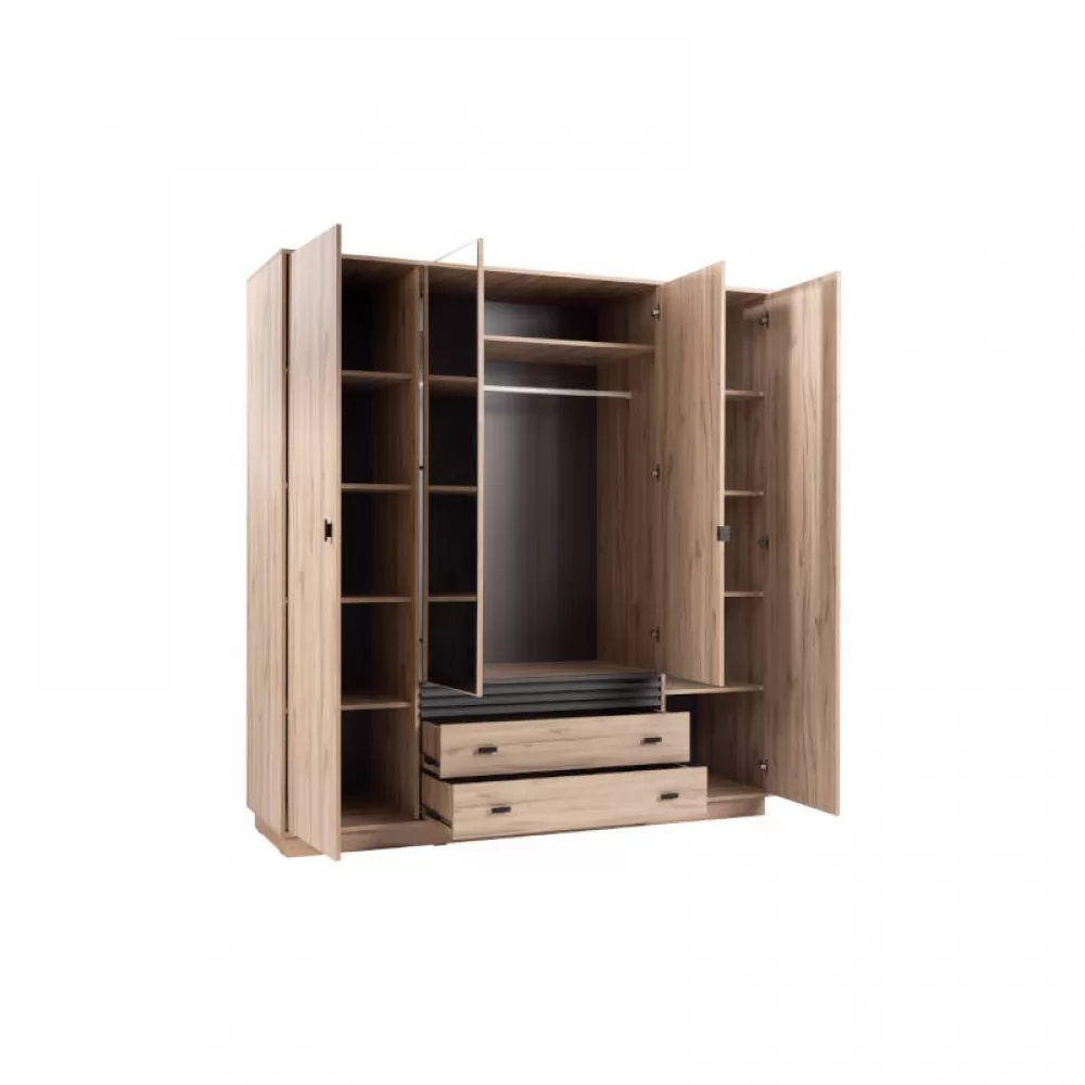 Prostorna garderobna omara iz pohištvene kolekcije Allmo je kvalitetne izdelave. Omaro sestavljajo ptrije predali in štiri vrata. V notranjosti omare se nahajajo police in drog za obešanje oblačil. Kolekcija pohištva Allmo je zasnovana za kupce ki imajo radi dobro oblikovanje in moderne linije. Predstavlja serijo pohištva, ki je popolno za moderne ureditve. Pohištvo Allmo je zagotovilo za lepo dovršeno spalnico, predvsem pa ji bo dodalo svoj karakter. Brez dvoma bodo lesene ličnice v kombinaciji z antracitnimi lamelnimi poudarki poskrbele za izviren in moderen dizajn v prostoru. Kolekcija ima črne ročaje, ki v kombinaciji z barvo naravnega lesa dajejo vtis toplega in prijetnega prostora.
