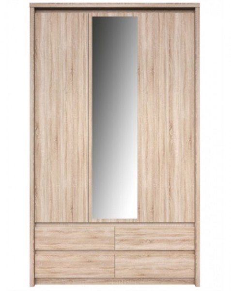 Moderna brezročajna omara ravnih linij. Omara ima 3 vrata in 4 predale s popolnim izvlekom. Na srednjih vratah je ogledalo. Poglejte si še druge elemente iz programa NORTON.
