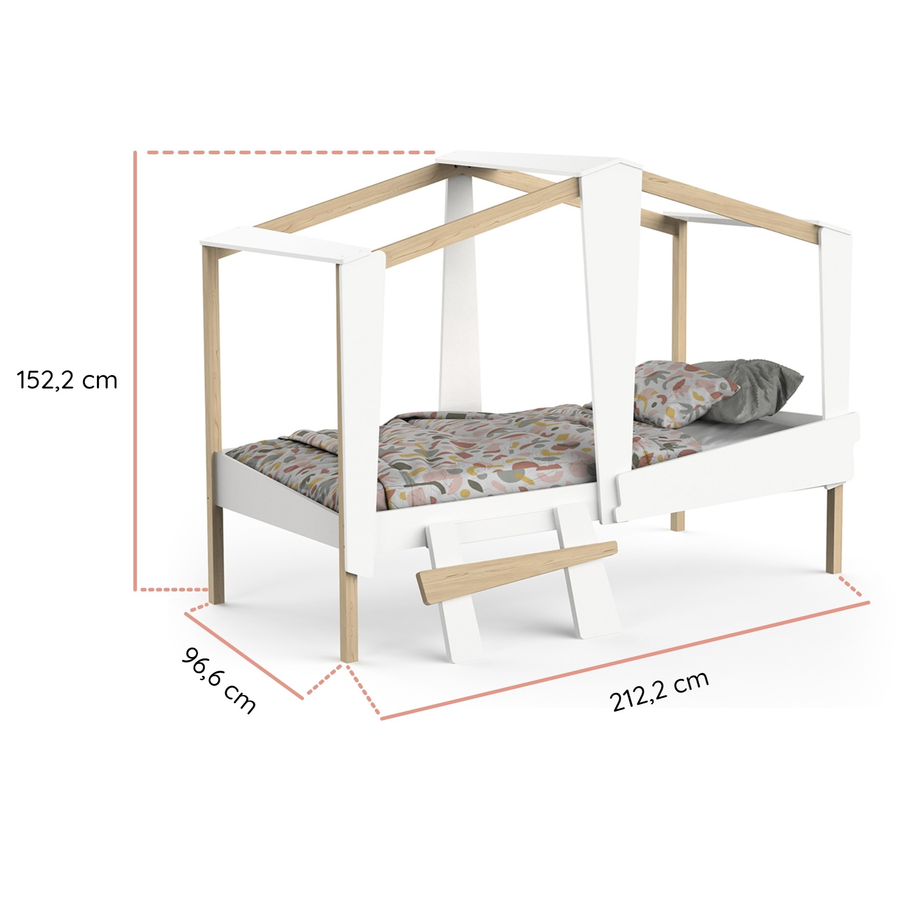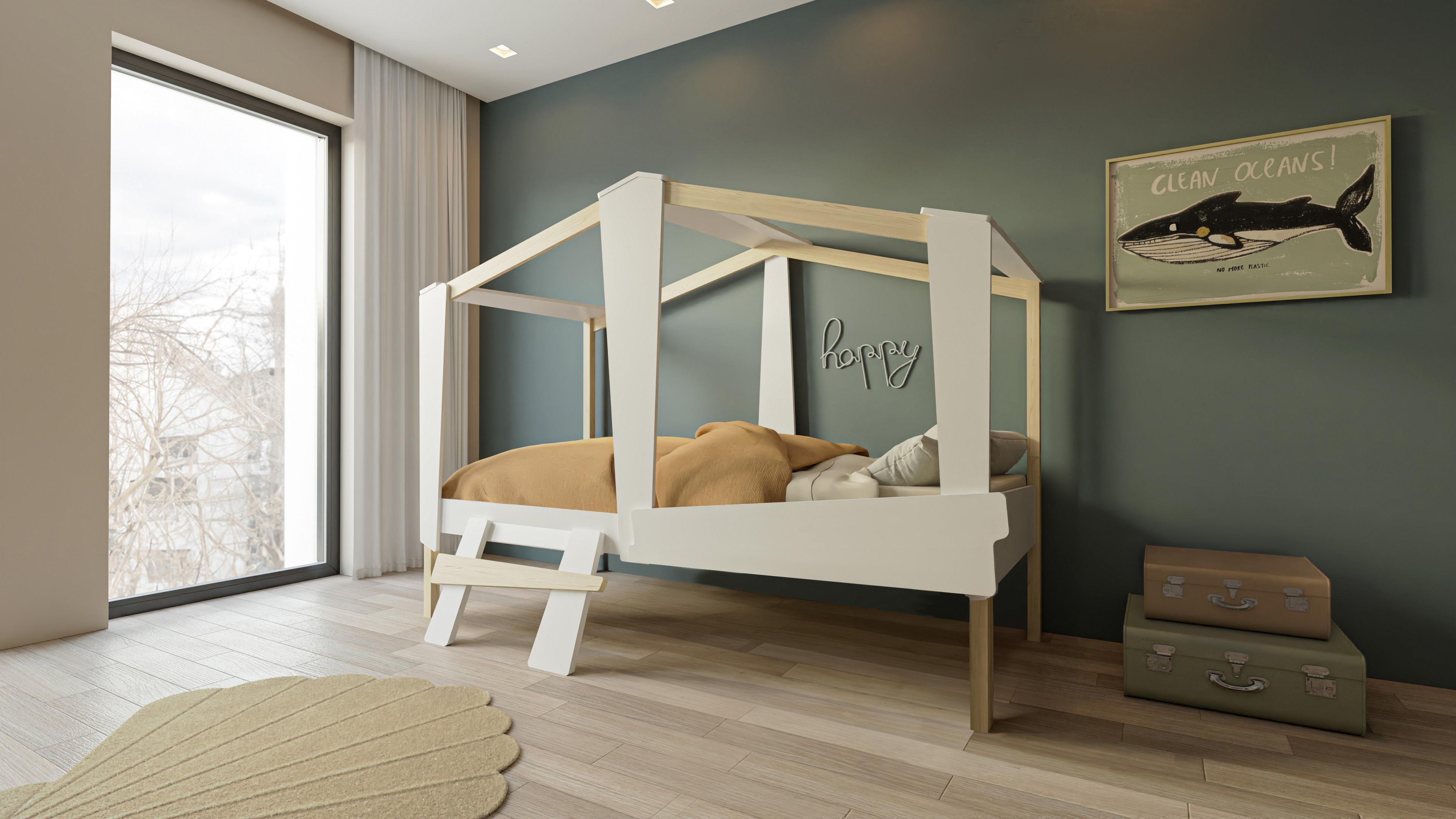 Sodobna postelja z visokim okvirom, podobnim hiši. Na volje je v mat beli barvi, z izpostavljenim okvirjem v imitaciji kronberškega hrasta. Izdelana je v Franciji, iz kombinacije lakiranega MDF in masivnega borovega lesa. Vse barve, uporabljene v izdelku so narejena na vodni osnovi, brez uporabe težkih kovin ali kemikalij.