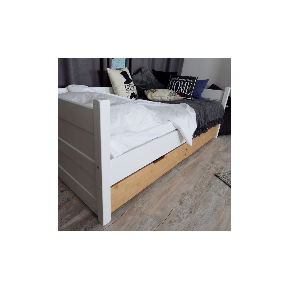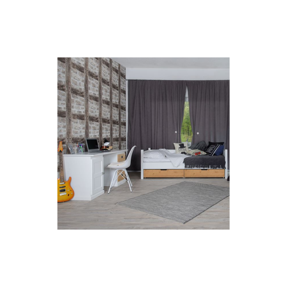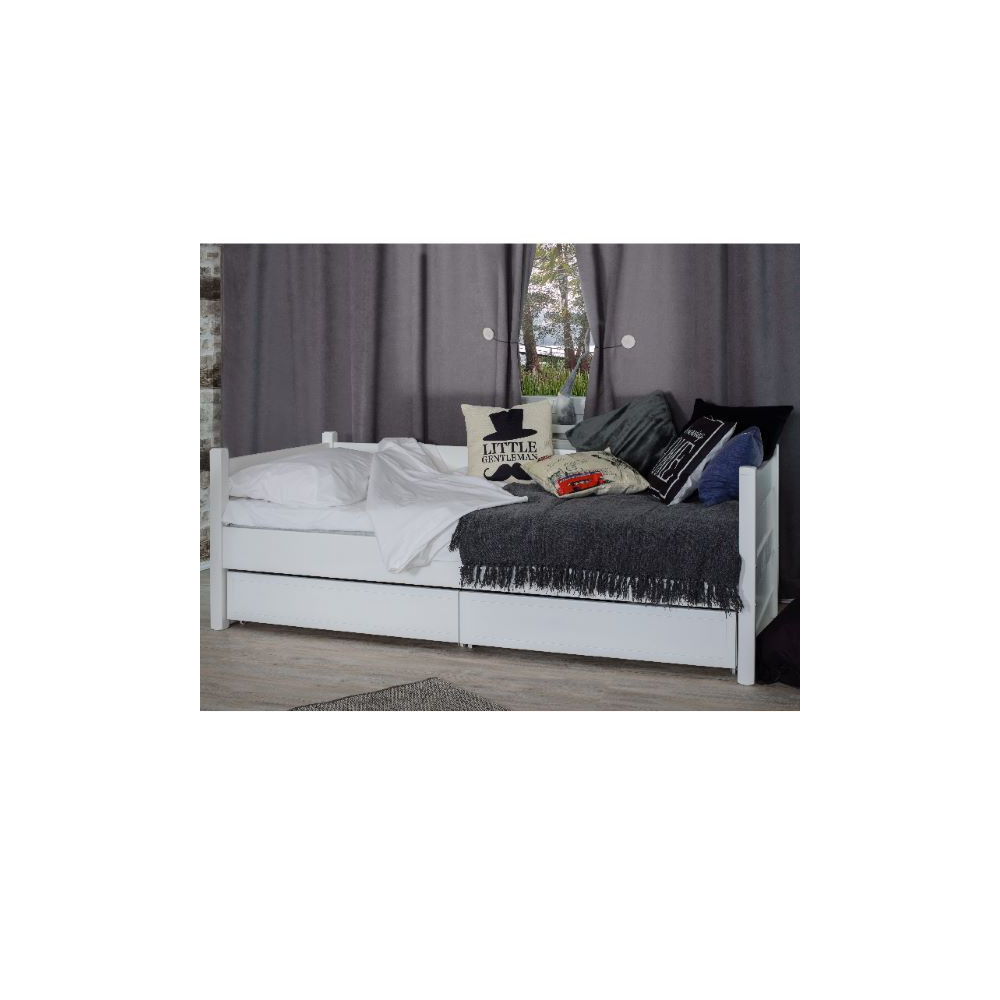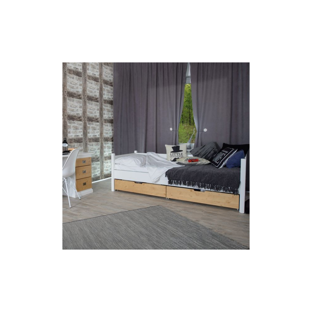 Postelja v stilu kavča z visokim okvirjem na treh straneh ima pod ležiščem dva izvlečna predala s počasnim (tihim) zapiranjem. Postelja je v celoti narejena iz kombinacije masivnega lesa bukve in MDF materiala. Vzglavje postelje ima v notranjosti polnilo iz MDF-a, in pa dno predala narejeno iz veznih plošč. Postelja v beli barvi ima predal narejen iz masivnega lesa, razen manjši deli čelne stranice so iz MDF materiala. Postelja, ki pa ima predal v natur barvi, ima masiven tudi celoten sprednji čelni del predala. Posebnost postelje so profilirane stranice, ki še poudarijo rustikalen, brezčasen izgled. Primerna za vzmetnico dimenzije 90x200 cm. Vzmetnica in letveno dno nista vključena. Maksimalna nosilnost postelje: 150 kg. Postelja je na voljo z vratci predalov v beli barvi ali v natur barvi rustikalne smreke, ki je barvana v barvo hrasta. Višina ležišča je 41 cm. Talni nosilec letvenega okvirja je ob strani globok 10,9 cm.