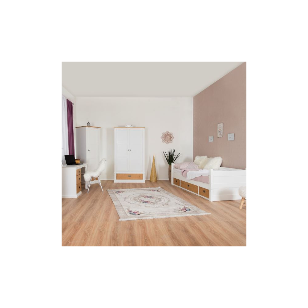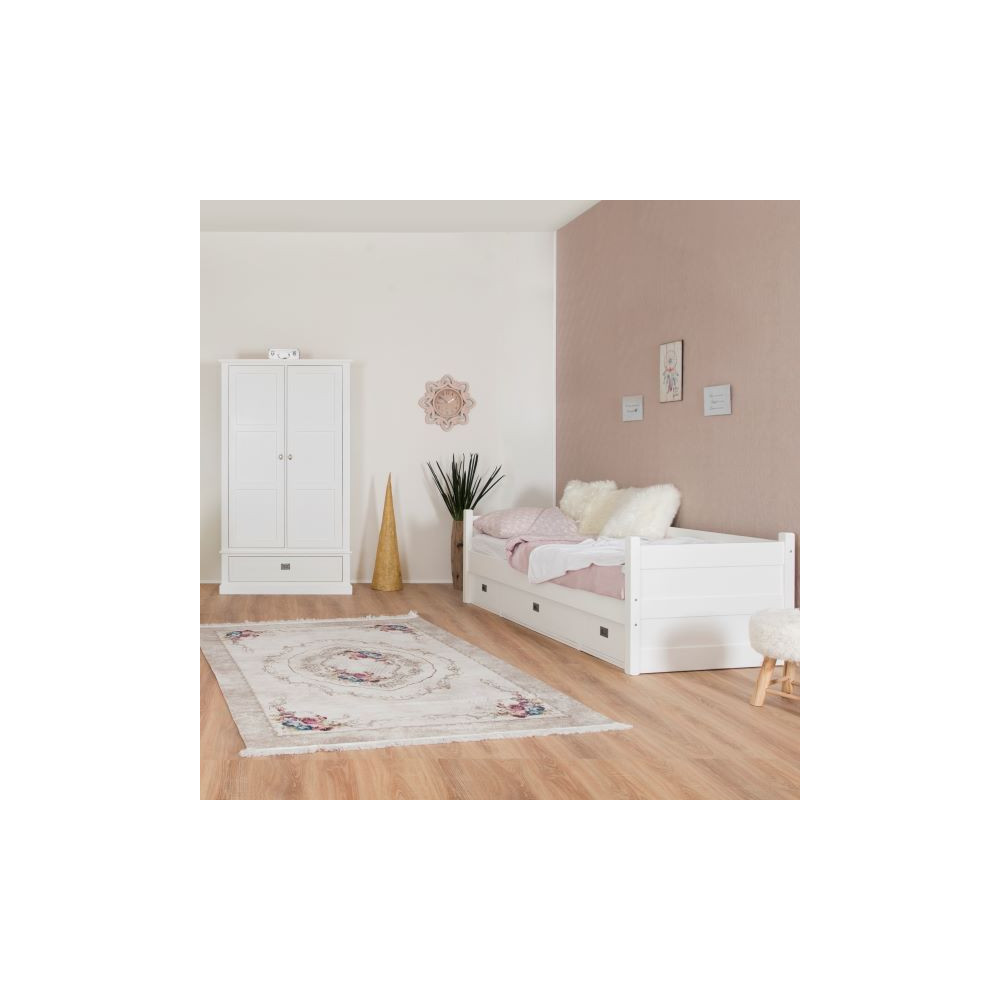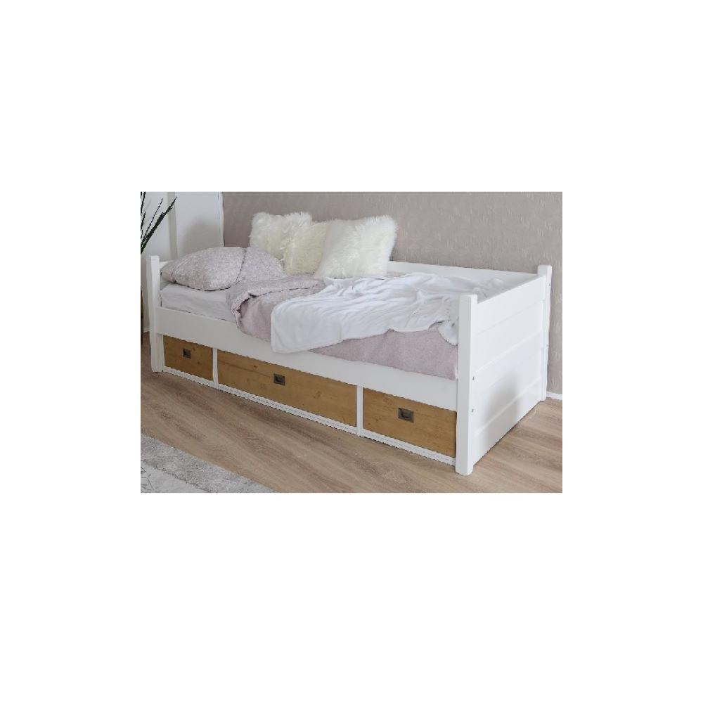 Postelja v stilu kavča z visokim okvirjem na treh straneh. Postelja je v celoti narejena iz kombinacije masivnega lesa bukve in MDF materiala. Vzglavje postelje ima v notranjosti polnilo iz MDF-a, in pa dno predala narejeno iz veznih plošč. Postelja v beli barvi ima predal narejen iz masivnega lesa, razen manjši deli čelne stranice so iz MDF materiala. Pod posteljo se nahajajo trije predali, stranska manjša in sredinski večji. Kovinski ročaji so v obliki držala in v klasičnemu dizajnu. Primerna za vzmetnico dimenzije 90x200 cm. Vzmetnica in letveno dno nista vključena. Predali imajo počasno (tiho) zapiranje. Maksimalna nosilnost postelje: 150 kg. Postelja je na voljo v beli barvi ali z ličnicami predalov v natur barvi. Natur ličnice so narejen iz smrekovega lesa, barvanega v barvo hrasta. Višina ležišča je 41 cm. Talni nosilec letvenega okvirja je ob strani globok 10,9 cm.