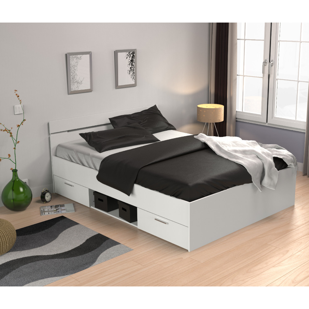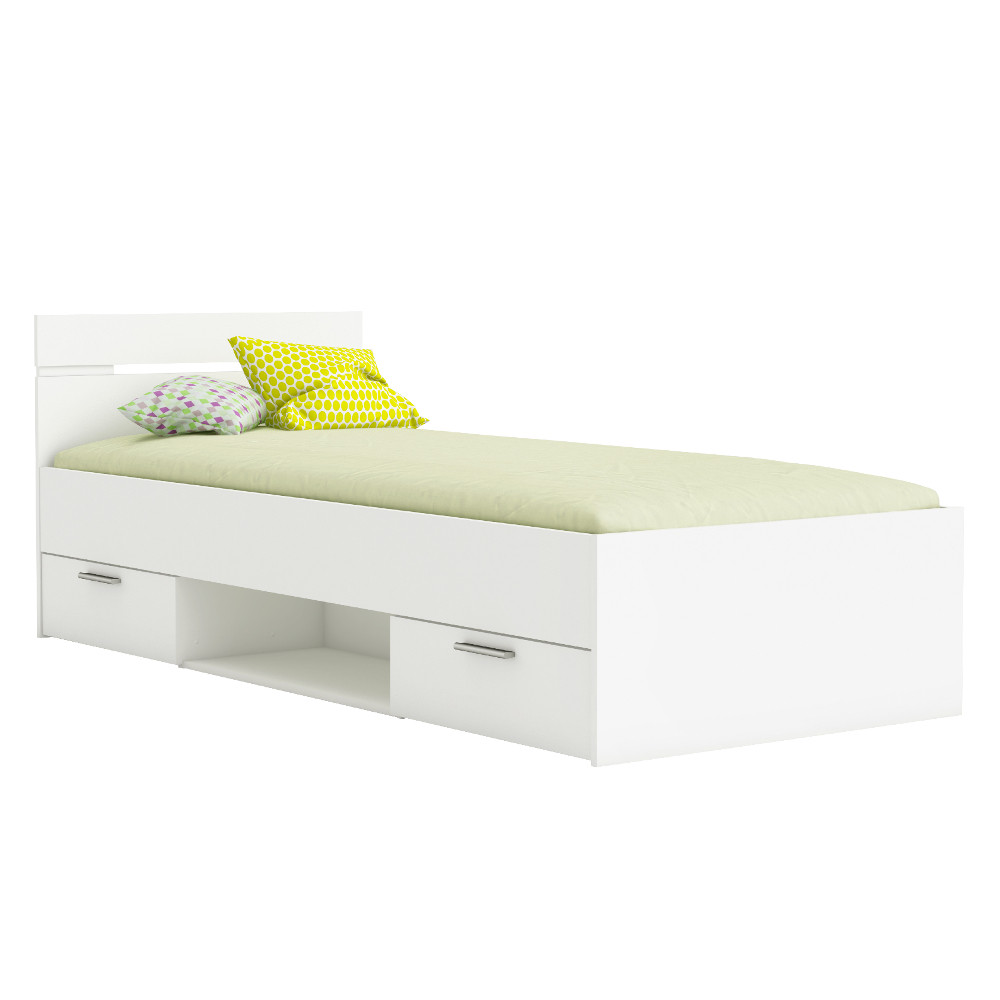Praktična postelja v beli ali sonoma barvi. Vsebuje dva predala 56x33x11 cm, na kovinskih vodilih in med njima poličnik 70x36x20 cm, ki se lahko montirajo levo ali desno. Zato je ena stran postelje vedno lahko ob steni. Maksimalna nosilnost ležišča 90x200 cm je 100 kg, maksimalna nosilnost ležišča 140x200 cm pa je 200 kg. Vzmetnica in letveni pod nista vključena.