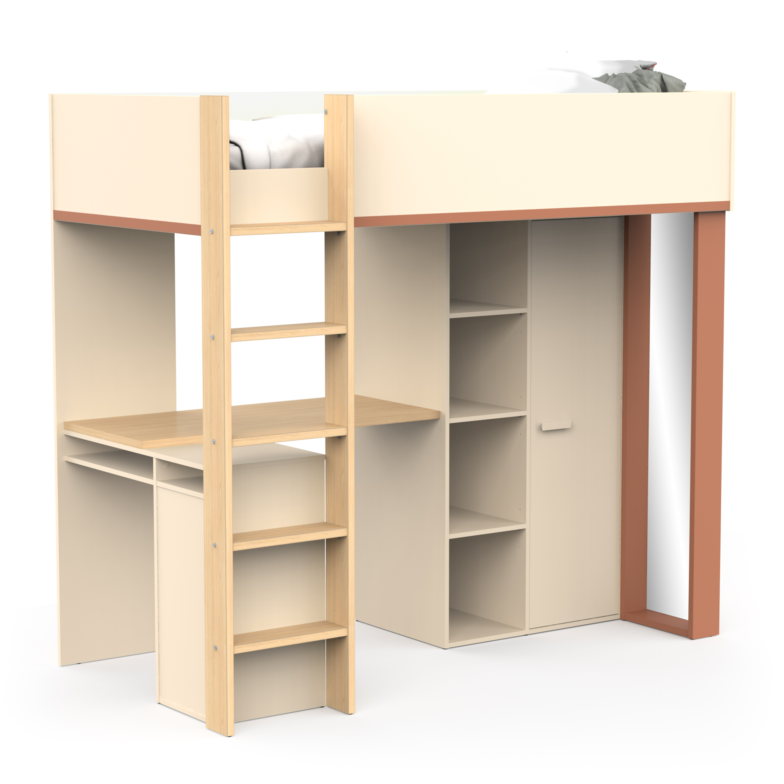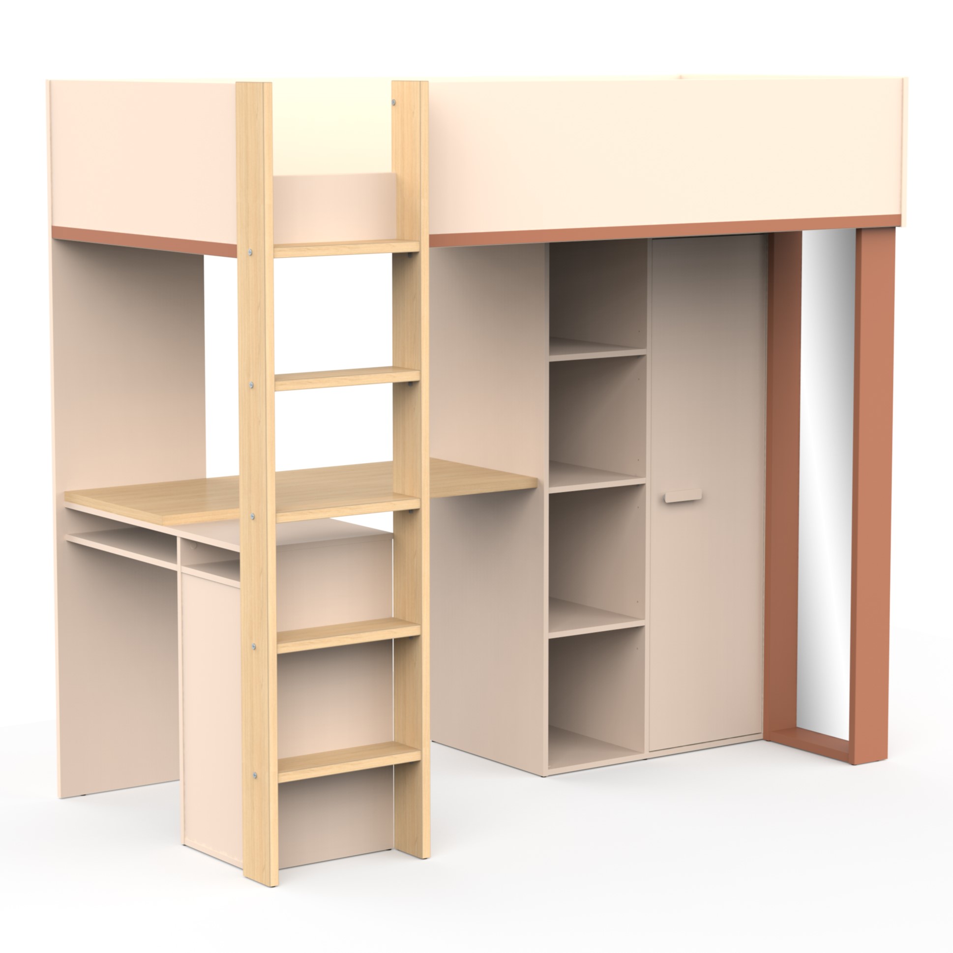 Kombinacija visoke postelje, pisalne mize ter več prostorov za shranjevanje, ki predstavlja odlično rešitev za prostorske stiske v otroški sobi. Visoka postelja je izdelan iz iveralnih plošč debelin 1,5, 1,8 in 2,5 cm, oblečenih v melamin, in je na voljo v dveh barvnih varijantah, kombinaciji hrasta, bež in rjave barve ter v kombinaciji hrasta, rjave in sive barve. Mizna plošča v imitaciji hrasta, ki lahko zdrži do 25 kg je montirana na levi strani, skupaj z majhnim kabinetom in lestvijo. Na drugi strani je poličnik s tremi policami ter visok kabinet z eno obešalno letvico. Zrcalo ki je montirano zraven veikega kabineta meri 141x32 cm in je debelo 3 mm. Ležišče na vrhu ima maksimalno obremenitev do 100 kg. Celoten pograd je narejen v Franciji.