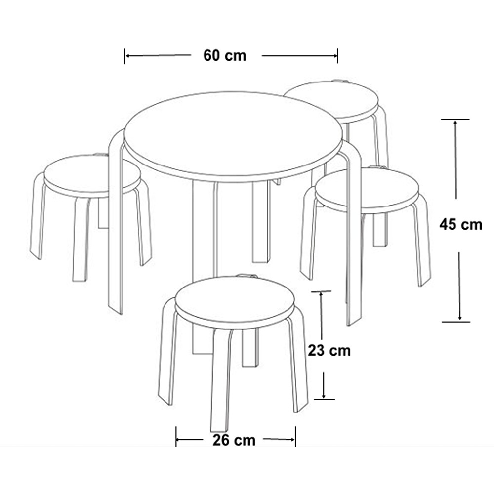 Otroški komplet sestoji iz ene mize in štirih stolčkov z različnimi barvami sedišč. Miza ima premer 60 cm, stolčki imajo premer 26 cm in sedišče na višini 23 cm. Maksimalna obremenitev stolov in mize je 35 kg.