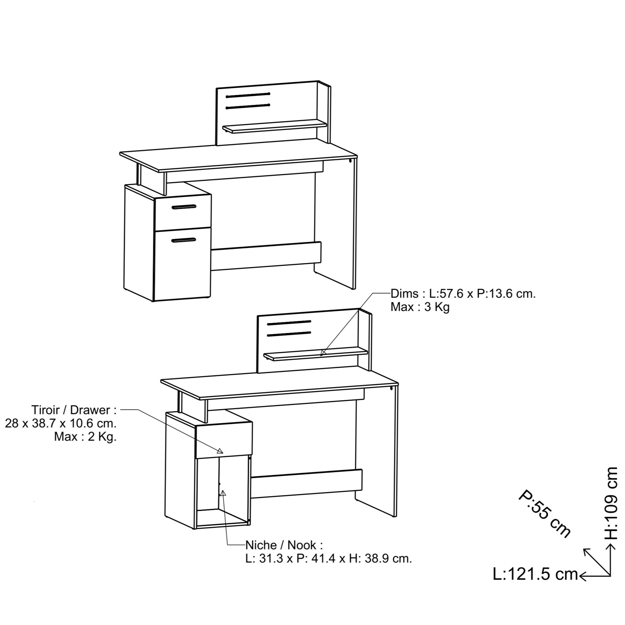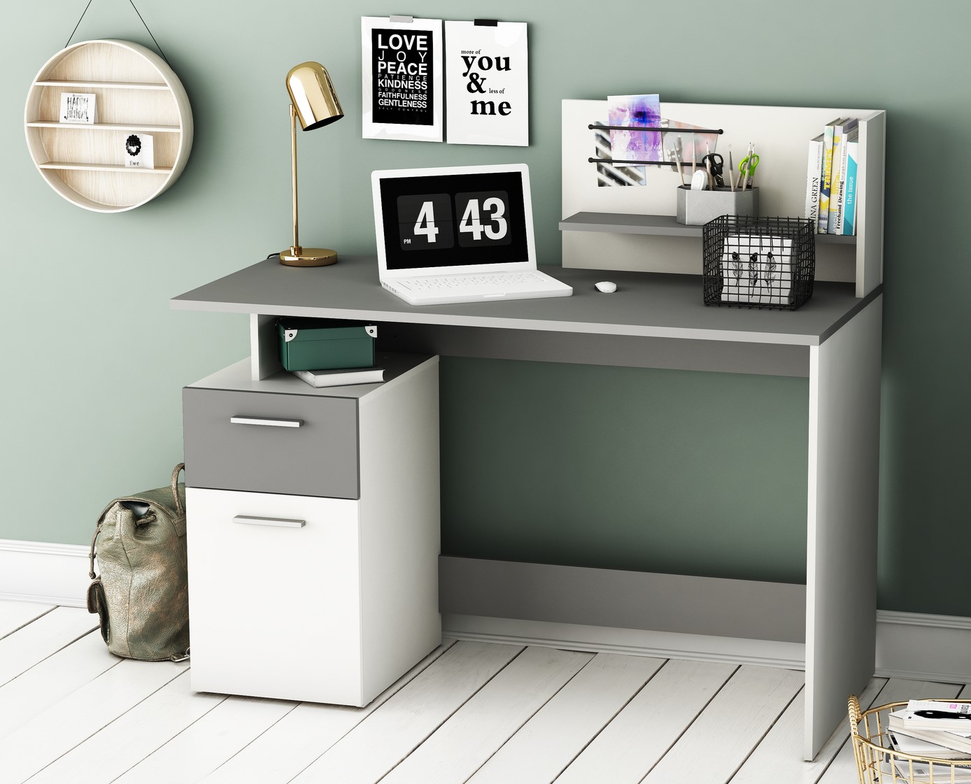 Kompaktna pisalna miza, zasnovana tako, da ustvari optimalno delovno površino. Nevtralna sivo-bela barvna shema se zlahka ujema z širokim izborom stilov in dekoracij. Celotna miza je narejena iz kakovostnih iveralnih plošč, oblečenih v melamin, debeline 1,5 cm. Mizna plošča ima dimenzije 121,5 x 55 cm, pod njo pa je na eni strani nameščen kabinet z enimi vrati in velikostjo 31x39x43 cm, en predal velikosti 28x39x12 cm ter nad predalom še majhen odprt prostor kamor lahko odložite manjše predmete. Namizna enota je opremljena z eno polico ter dvema elastičnima trakovoma za držanje zapiskov, fotografij ali podobnih stvari.