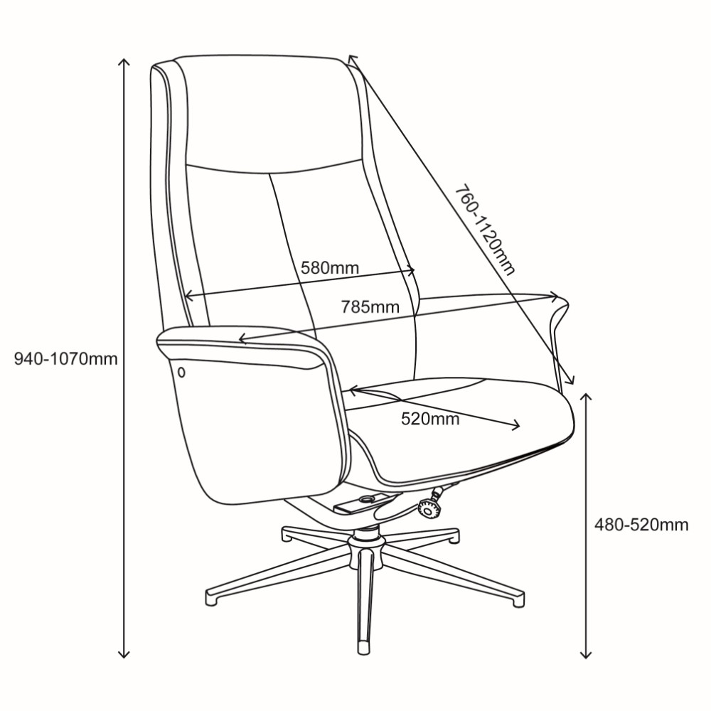 Velik počivalnik, opremljen z rokonasloni ter ločenim naslonom za noge, vse oblazinjeno z udobno mikrofibro v rjavi barvi. Počivalnik se lahko zavrti za 360°, z relaks funkcijo 120°. Naslon za noge nima nobene premične funkcije in je fiksen. Po hrbtišču je prešit z okrasnimi šivi, ki popestrijo dizajn počivalnika. Za odlično udobje med sedenjem je počivalnik napolnjen z več plastmi pene, z gostotami med 24 in 28 kg/m³. Ohišje ter podnožje počivalnika so narejeni iz kovine, debeline 1,2 mm, ter prašno lakirane s črno barvo za boljšo zaščito pred okoljem. Maksimalna nosilnost počivalnika je 120 kg.
