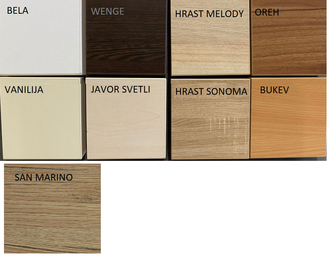 Barve: Bela, Vanilija, Javor svetli, Hrast melody, Hrast sonoma, Hrast sanmarino, Bukev, Oreh in Wenge