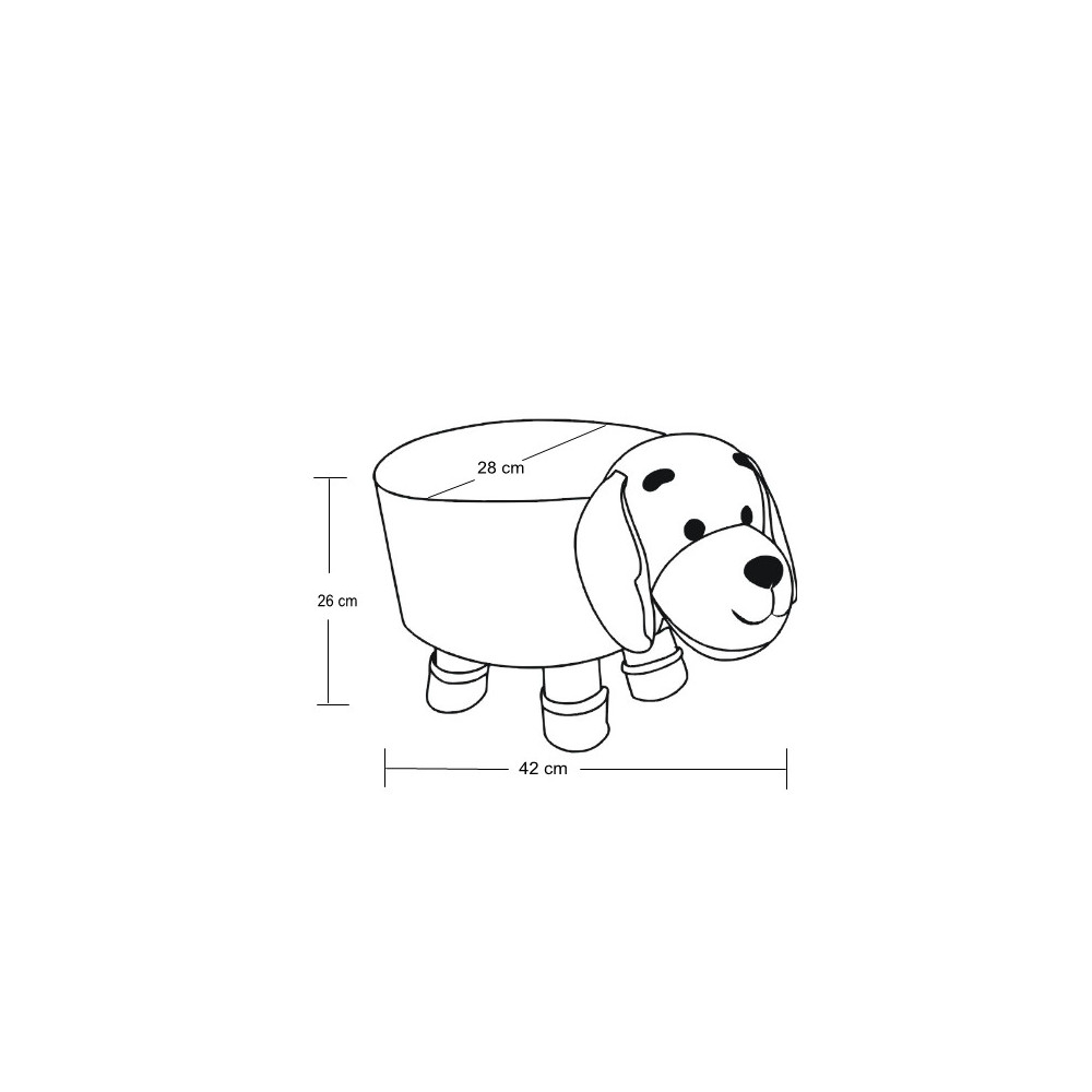 Plahutajoča ušesa in vesel nasmeh psička razveselita vsakega otročička. Mehek tabure je narejen iz masivnega borovega lesa in oblazinjen v peno ter odstranljivo in pralno kvalitetno tkanino. Dimenzija sedeža: 28x28x26 cm. Maksimalna nosilnost stola: 100 kg.