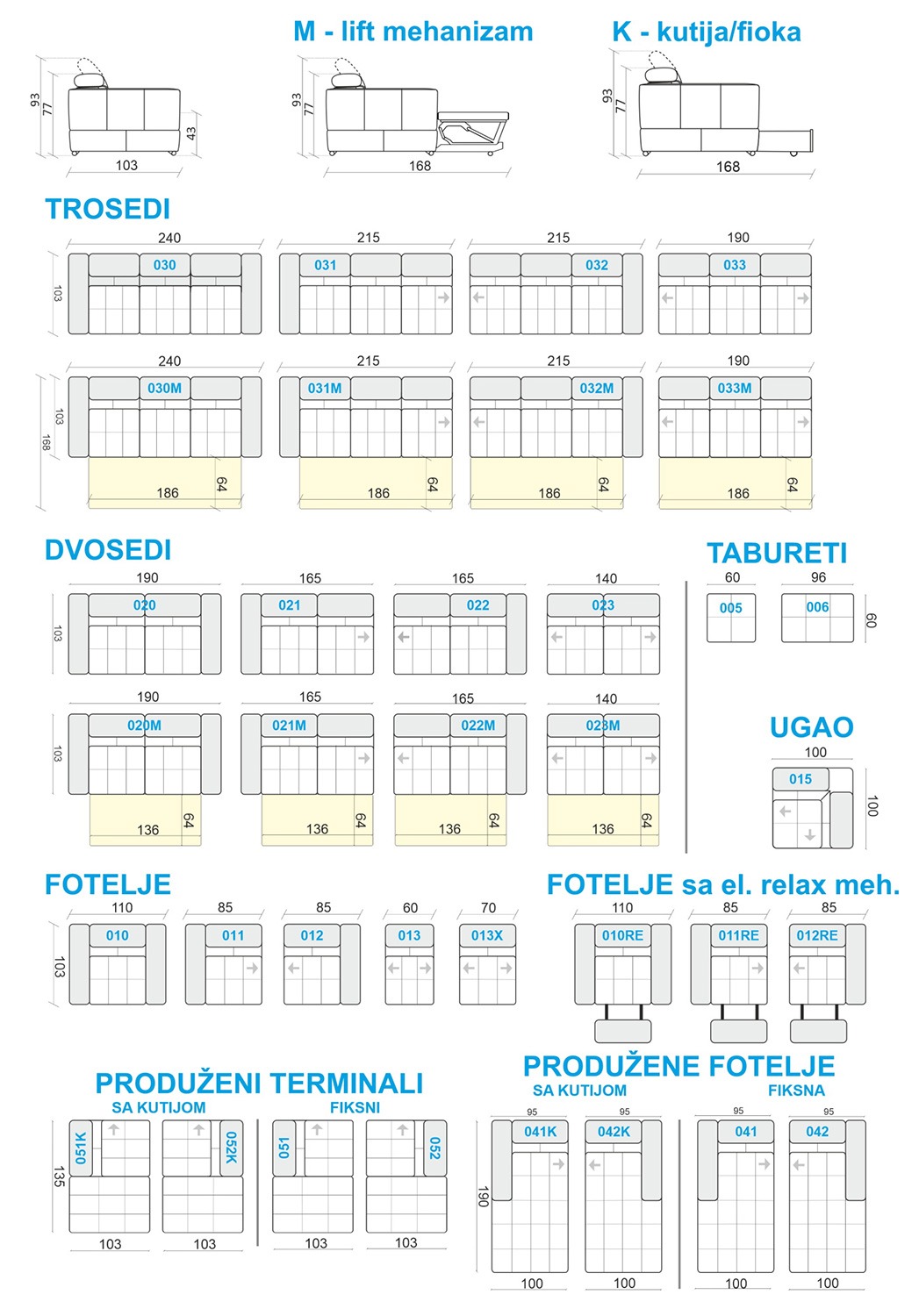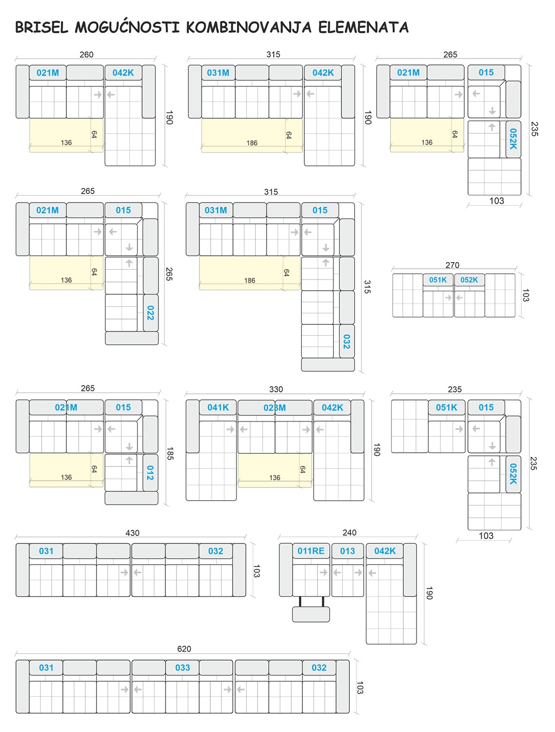 Kolekcijo Brisel lahko sestavljate iz različnih elementov: dvosed, fotelj, kotna sedežna garnitura, tabure,... ki jih najdete spodaj.