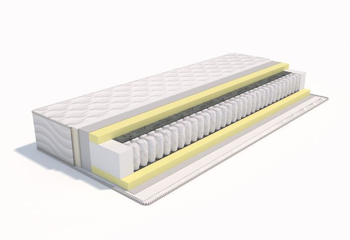 Višina vzmetnice 25cm po naročilu možna tudi višina 28cm ali 30cm. Negorljiva, antibakterijska prevleka, prešita z 100% zimsko volno in 100% PES z letne strani, ter pomožnimi ročaji za obračanje na bočnih straneh. Jedro vzmetnice sestavljeno iz ojačanega žepkastega vzmetenja, trdote H2 z obeh straneh, ter obložen je z mehkim filcom. PU pena z močnimi stranskimi ojačitvami prav tako s PU pene pa zagotavlja kompaktnost in dolgotrajnost vzmetnice.
