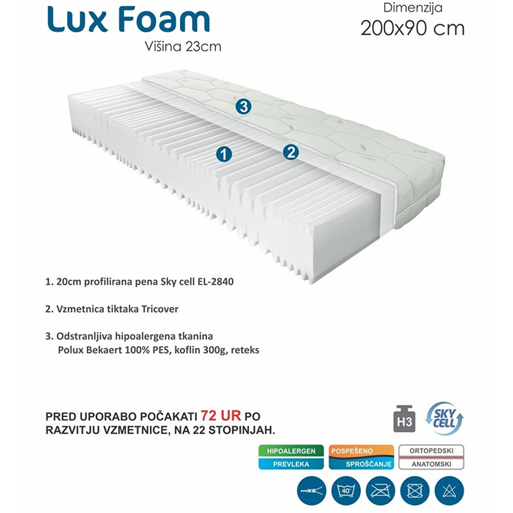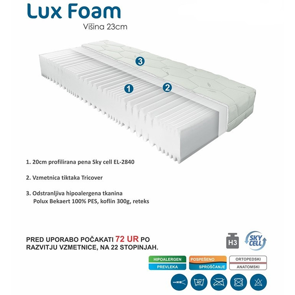 Ta vzmetnica debeline 23 cm je oblečena v tkanino iz 100% poliestra. Celotno notranjost vzmetnice zapolnjuje 20 cm debela plast profilirane pene. Gre za peno tipa SKY CELL EL-2840 in zapolnjuje celotno notranjost vzmetnice. Pena je prekrita s Tricover pokrivalom, ki ločuje plast pene od zunanje prevleke. Debela zunanja prevleka je hipoalergena in se lahko sname z vzmetnice. Vzmetnica je trdote H3, primerna za ljudi do teže 130 kg, ki si želijo tršo vzmetnico. Pred uporabo počakajte 72 ur po razvijanju vzmetnice na 22 stopinj.