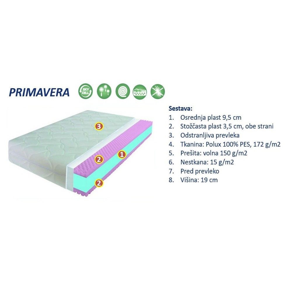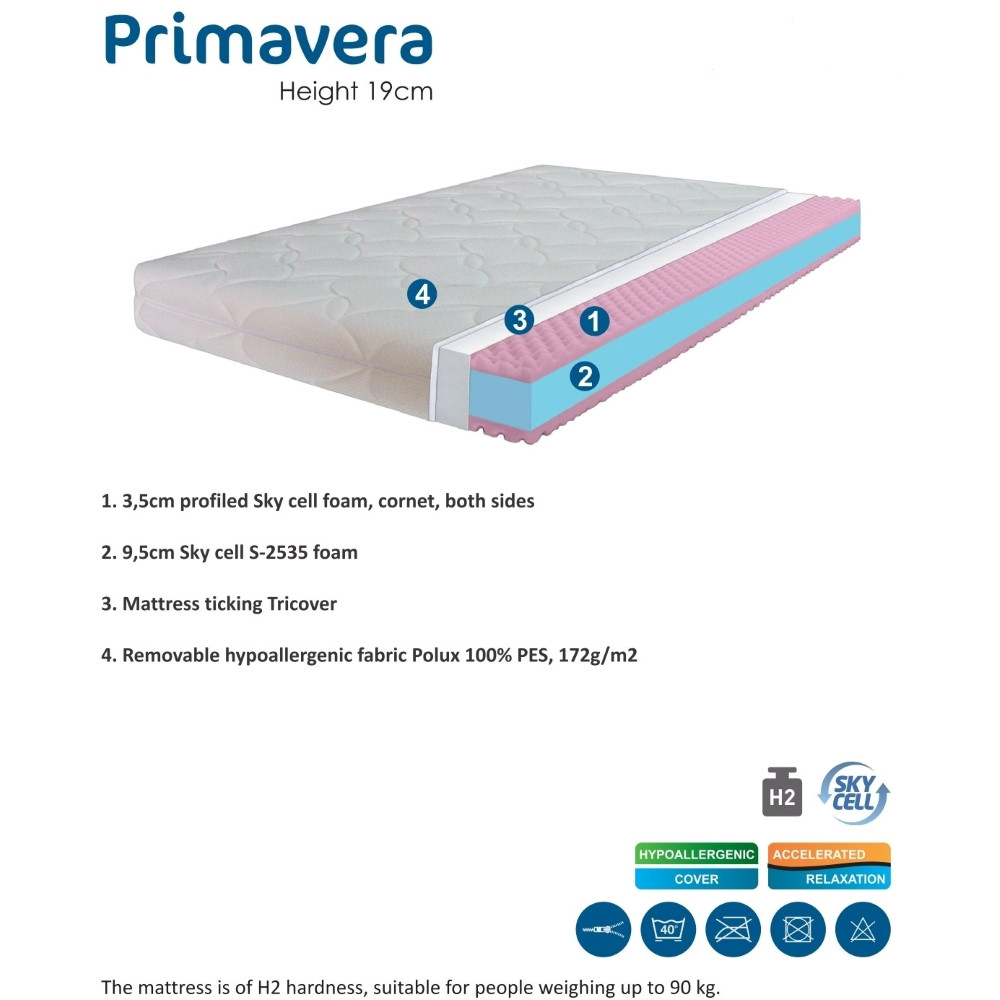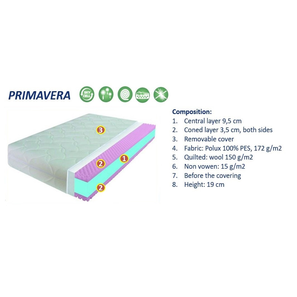 Ta vzmetnica debeline 19 cm je oblečena v tkanino iz 100% poliestra. V notranjosti vzmetnice se nahaja več plasti pene. V sredini je centralna plast pene SKY CELL, debeline 9,5 cm, ki je na obeh straneh obdana z dodatno plastjo pene debeline 3,5 cm in dodatno plastjo iz trpežne prešite volne, ki ločuje peno od prevleke. Zunanja poliestrska prevleka ima maso 172 g/m2, je hipoalergena in se lahko sname z vzmetnice. Vzmetnica je trdote H2, primerna za ljudi do teže 90 kg, ki si želijo razmeroma mehko vzmetnico.
