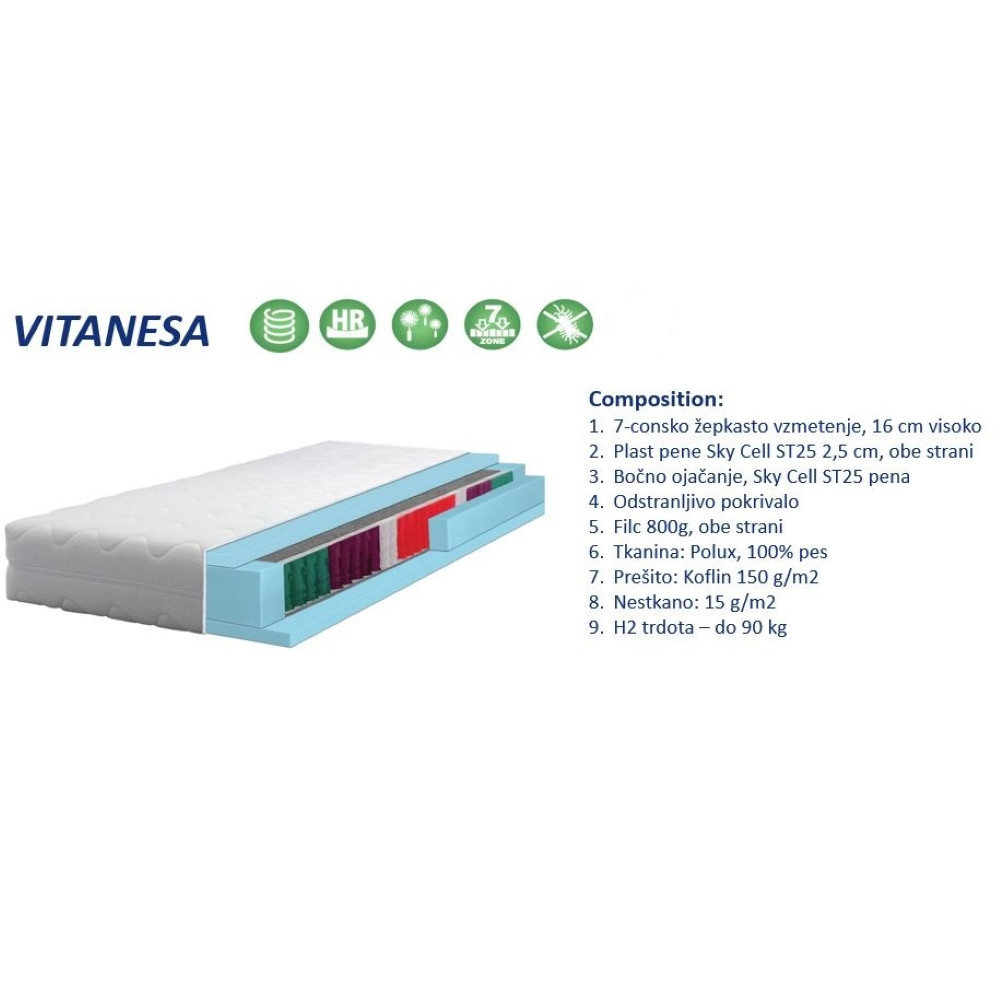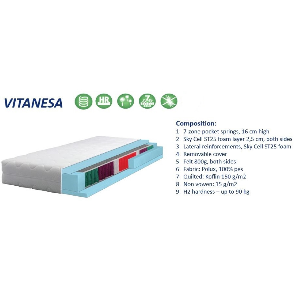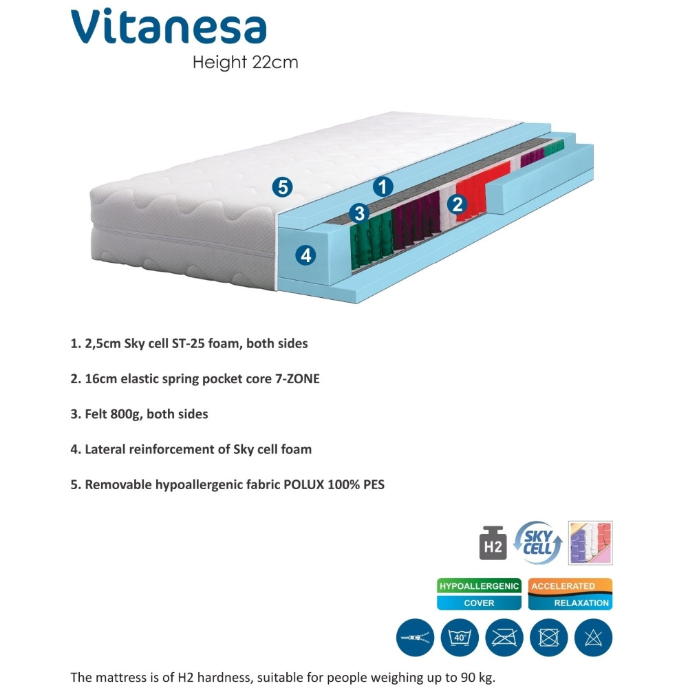 Ta vzmetnica debeline 22 cm je oblečena v tkanino iz 100% poliestra. Vzmetnica je zasnovana s sedmimi razdelilnimi conami, ki učinkovito razporejajo telesno težo in zagotavljajo odlično prileganje telesu. V notranjosti vzmetnice se nahajajo žepkaste vzmeti, velikosti 16 cm. Boki vzmetnice so dodatno ojačani. Vzmetenje je na obeh straneh pokrito z 2,5 cm debelo plastjo poliuretanske pene SKY CELL. Zunanja poliestrska prevleka se lahko sname z vzmetnice. Vzmetnica je trdote H2, primerna za ljudi do teže 90 kg, ki si želijo razmeroma mehko vzmetnico.